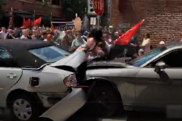 El Universal/La Voz de Michoacán Charlottesville, Virginia.Al menos un vehículo embistió el sábado a una multitud en Charlottesville, Virginia, horas después que la policía dispersó una riña entre nacionalistas blancos y contramanifestantes, dijeron testigos, pero no está claro si el incidente se relaciona con los enfrentamientos de más temprano. El episodio involucró a tres vehículos y había varios heridos, informó la portavoz de la ciudad de Charlottesville, Miriam Dickler. Usuarios de redes sociales publicaron videos que muestran el momento en el que el auto embiste a la multitud y choca contra otros dos vehículos. https://twitter.com/Univ_Mundo/status/896450321316282370 Al menos cuatro personas resultaron heridas en el sitio donde el vehículo arrolló a los manifestantes, incluida una persona que fue trasladada por paramédicos. Varias ambulancias llegaron al lugar poco después del incidente. Las autoridades han confirmado el arrollamiento, pero no han ofrecido por ahora detalles acerca del motivo, responsable y cifra de heridos. El suceso ocurrió cerca de las 13.00 hora local (17.00 GMT) poco después de que el gobernador de Virginia, Terry McAuliffe, declarara el estado de emergencia en la ciudad, y de que el presidente estadounidense, Donald Trump, condenara "todo lo que representa el odio".