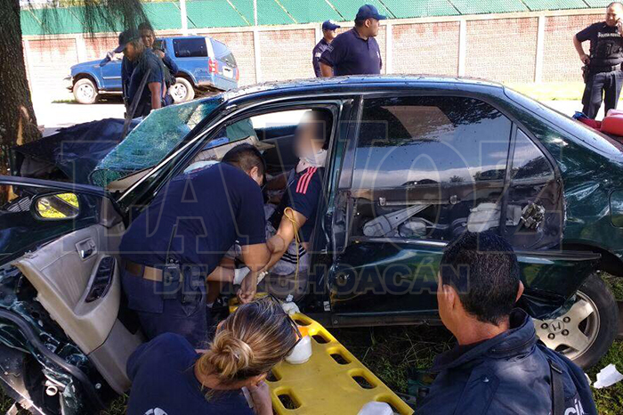 Alejandro Serrano/La Voz de Michoacán Huiramba, Michoacán. Un automóvil se estrelló de lleno contra un árbol en la carretera Morelia-Pátzcuaro, a consecuencia del accidente el copiloto falleció, mientras que el chofer de la unidad quedó lesionado, según la información obtenida en el lugar de los hechos. El suceso fue la mañana de este sábado, en el kilómetro 34+900, en este municipio de Huiramba, sitio que fue acordonado por los elementos de la Policía Federal de la División de Seguridad Regional y los de Seguridad Pública. Los Bomberos de Pátzcuaro con equipo hidráulico rescataron el cuerpo sin vida. El finado está en calidad de desconocido, refirieron contactos oficiales. El herido fue canalizado de inmediato a un nosocomio de la región. Las víctimas iban en un carro de la marca Honda Accord, de color verde botella, con placas de circulación MXH-2979 del Estado de México. El asunto quedó en las manos de la Unidad de Atención Temprana y de la Coordinación General General de Servicios Periciales de la Procuraduría General de Justicia del Estado de Michoacán.