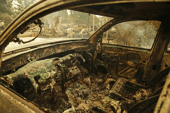 The remains of an automobile sit in the Coffey Park area of Santa Rosa, Calif. An onslaught of wildfires across a wide swath of Northern California broke out almost simultaneously then grew exponentially, swallowing up properties from wineries to trailer parks and tearing through both tiny rural towns and urban subdivisions. (AP Photo/Ben Margot)