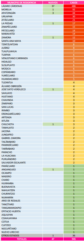 Paola Franco / La Voz de Michoacán Son 945 casos acumulados de COVID-19 los que registra este sábado Michoacán, dio a conocer el gobierno estatal mediante el informe diario que emite. Mientras que el día de ayer se reportaban 850 contagios, en las últimas 24 horas hubo 95 nuevos casos. Y de viernes para sábado se registraron 60 nuevos contagios. Esta cifra de 95 nuevos casos en 24 horas, es la más alta que se había tenido en el estado. El virus del SARS-CoV-2 ha cobrado la vida de 88 personas en territorio michoacano, tres más que el día de ayer. Imagen: La Voz de Michaocán. Información: Gobierno del Estado. Hoy por la mañana, el gobierno estatal emitió un reporte de 48 nuevos casos, por lo que hasta hace algunas horas la cifra era de 898 contagios en Michoacán. Por otra parte, se encuentran en estudio 709 casos sospechosos de COVID-19, mismos que se confirmarán o descartarán una vez que se tengan los resultados de las pruebas. El coronavirus en Michoacán ha llevado a la hospitalización a decenas de personas, actualmente son 57 los pacientes internados, de los cuales 35 se encuentran graves. La enfermedad la han librado 340 personas, por lo que son 605 los habitantes michoacanos que hoy tienen el virus activo. ¿Dónde fueron los nuevos casos? Nuevamente Lázaro Cárdenas registró casos nuevos, en las últimas 24 horas registró 52 más (15 ya los habían anunciado este sábado por la mañana), sumando al día de hoy 486. Morelia tuvo 10 nuevos casos, entre el reporte del viernes por la noche y el emitido este sábado, alrededor de las 20:00 horas. Apatzingán tuvo 8 casos más, La Piedad 4, Uruapan y Múgica presentaron 2 contagios más, cada uno. Mientras que un caso nuevo se registró en los municipios de: Zamora, José Sixto Verduzco, Chilchota, Angangueo, Zitácuaro, Zinapécuaro, Maravatío, Pátzcuaro, Hidalgo, Sahuayo, Ixtlán, San Lucas, Paracho, Tacámbaro, Epitacio Huerta y Charo. Mientras que las tres defunciones registradas en las últimas 24 horas fueron en Múgica, Zitácuaro y La Piedad. Contagios por municipio Muertes registradas
