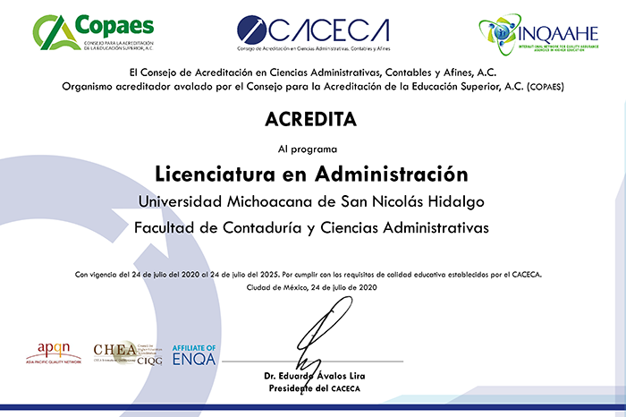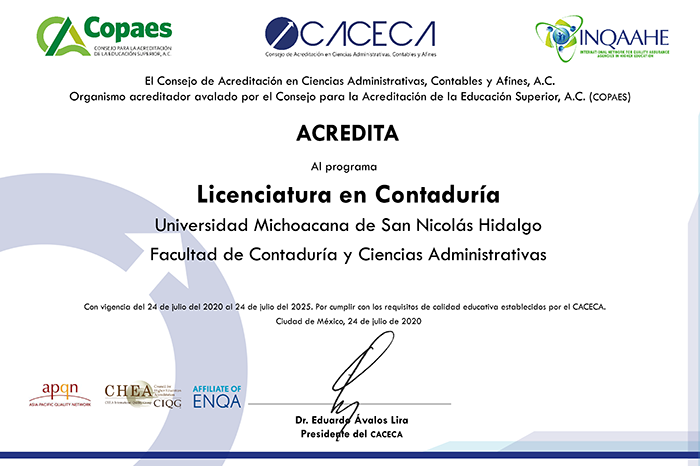 Redacción / La Voz de Michoacán Morelia, Michoacán. La Facultad de Contaduría y Ciencias Administrativas (FCCA) de la Universidad Michoacana de San Nicolás de Hidalgo (UMSNH) logró la acreditación de los programas de licenciatura en Administración y Contaduría por un periodo de cinco años. La FCCA de la máxima casa de estudios de la entidad se ubica en el segundo lugar a nivel nacional dentro de las universidades públicas que logran la acreditación en línea. El organismo encargado de la evaluación, que se llevó a cabo a distancia, es el Consejo para la Acreditación en Ciencias Administrativas, Contables y Afines (CACECA), avalado por el Consejo para la Acreditación de la Educación Superior (COPAES). El periodo de la acreditación de los programas académicos de Contaduría y Administración tendrá una vigencia del 24 de Julio del 2020 al 24 de Julio del 2025, de acuerdo al dictamen firmado por el Dr. Eduardo Ávalos Lira, presidente del CACECA, y avalado también por el Consejo para la Acreditación de la Educación Superior, A. C. (COPAES) y por el International Network for Quality Assurance Agencies in Higher Education (INQAAHE). Este reconocimiento a la calidad de los programas académicos otorgados por el CACECA es en beneficio no solo de los egresados de la Facultad de Contaduría y Ciencias Administrativas, sino también para los 2,771 alumnos de la licenciatura en Contaduría y los 1,730 estudiantes de la licenciatura en administración con los que cuenta la FCCA, que representan el 12.5% de la matrícula evaluable de la UMSNH. La acreditación es el mecanismo por el cual las universidades generalmente aseguran la calidad educativa y adquieren el reconocimiento dentro de sus comunidades en un contexto regional, nacional e internacional. Además, la acreditación y la certificación son la manera como las universidades sobresalen entre la multitud posicionándolas como universidades de calidad y que las distingue de aquellas que están proliferando recientemente, ahora cuando la educación superior se ha convertido en otra mercadería de la actual economía global. "A nivel estatal, es el primer proceso de reacreditación que se logra realizar en línea, mientras que a nivel nacional la FCCA es parte de las 10 Instituciones que han logrado presentar su proceso de reacreditación y lograrlo, el siguiente paso es reacreditar el programa de licenciatura en Informática administrativa, la cual está en puerta en noviembre", señaló el Dr. Evaristo Galeana Figueroa. "Alumnos, profesores y trabajadores de la FCCA son los principales actores de este logro", finalizó el director de la Facultad de Contaduría y Ciencias Administrativas de la Casa de Hidalgo. El rector de la Universidad Michoacana, Dr. Raúl Cárdenas Navarro, celebró el logro de la reacreditación de los programas de licenciatura de la FCCA, y destacó la necesidad de permanecer con estándares académicos de calidad que permitan a la máxima casa de estudios del estado de Michoacán, seguir perteneciendo al Consorcio de Universidades Mexicanas (CUMex), ofreciendo así a los estudiantes y egresados nicolaitas, una alta competitividad académica.
