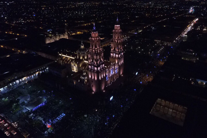 Guillermo Chávez/ Tsuri Chávez Morelia, Michoacán. La Catedral Metropolitana de Morelia estrenó iluminación escénica, la cual va a sumarse a los atractivos turísticos del Centro Histórico. El propósito del proyecto fue lograr una sincronía entre música, pirotecnia e iluminación, que en este caso incluirá diferentes colores para la parte de la fachada de este recinto religioso. Aquí las pruebas que ya se realizan: Los arreglos incluyen 805 luminarias, así como una inversión total de 16 millones de pesos, que se divide en una aportación federal de 8 millones y otra asignación de 8 millones por parte del municipio, según lo que informó el secretario de Desarrollo Metropolitano e Infraestructura, Juan Fernando Sosa. El propósito es crear un evento de calidad e innovador, ya que la fachada de la Catedral no se había iluminado con luces de color, además de que se incluirán la narración de algunos textos durante este espectáculo, con lo cual se agregan elementos de mayor dinamismo”, informó el presidente municipal de Morelia, Alfonso Martínez Alcázar, quien estuvo acompañado iluminación. Para la realización de estas modificaciones, Juan Fernando Sosa Tapia, secretario de Desarrollo Metropolitano e Infraestructura de Morelia, informó que también se han colocado 516 bases para luminarias nuevas y 21 controles que regulan la tonalidad de los focos led, mismos que también son una contribución nueva de este proyecto. Además se hizo la revisión del transformador de energía, del cableado, así como de medidas necesarias para proteger las instalaciones de la intemperie y del calor, tanto del techo como de las que se encuentran empotradas en el perímetro de la catedral. Cabe destacar que en esta ocasión se reemplazaron los focos de halógeno, por focos led, que son ahorradores, no generan tanto calor, por lo que no erosionan la cantera, además de que tienen una garantía de vida mucho mayor, informó Sosa Tapia.
