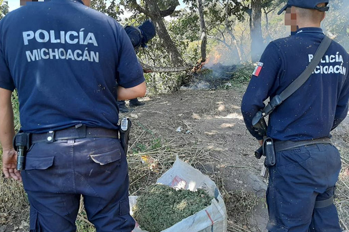 Redacción / La Voz de Michoacán Charo, Michoacán. Personal de la Secretaría de Seguridad Pública (SSP) encontró y destruyó un plantío de hierba color verde con las características de la marihuana y aseguró 30 kilogramos de la misma hierba. Elementos de la Policía Michoacán efectuaban recorridos sobre una brecha que conduce a la localidad La Cofradía, ubicando en las inmediaciones un predio con más de mil plantas de la citada hierba. De igual forma, se localizaron dos campamentos donde se realizaba el secado de dicha droga, asegurando 30 kilogramos de ésta. Tras llevar a cabo las actuaciones de ley, se le llevó a cabo la incineración del plantío y se procedió a incautar la hierba seca, para ser puesta a disposición de la autoridad correspondiente. Por la seguridad de la población michoacana, la SSP desarrolla acciones operativas que permitan combatir hechos que atenten contra el bienestar de la ciudadanía.