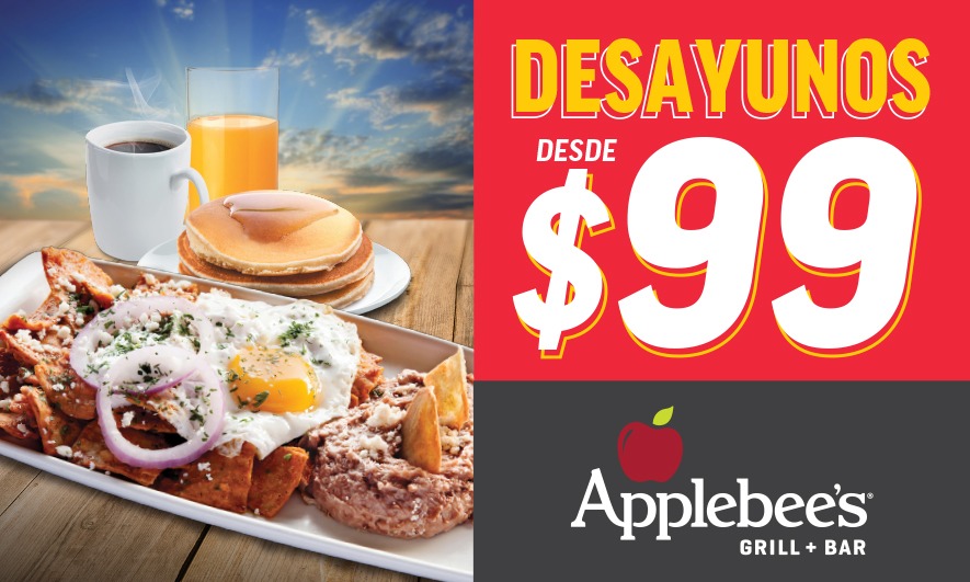 Restaurante Applebees reúne el mejor concepto de comida casual con exquisitos platillos para desayunar desde $99 pesos con café de refill todos los días, con un horario de  9:00 am a 12:00 p.m.