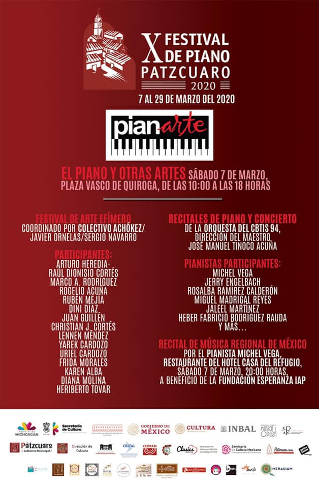 Pátzcuaro. Este sábado siete de marzo dará inicio el X Festival de Piano de Pátzcuaro, 2020, con la presentación de una serie de recitales, que se ofrecerán de manera gratuita en la plaza Vasco de Quiroga, a partir de las 10:00 am. “Celebramos los primeros diez años de realización de este festival, que representan para nosotros la consolidación de un proyecto que busca fomentar el disfrute y la práctica de una de las expresiones artísticas más apreciables entre las personas”, expresó Daniel Márquez, coordinador del Consejo Asesor de Promotores Culturales que organizan el evento, en coordinación con la Dirección de Cultura del gobierno de Pátzcuaro encabezado por Víctor Manuel Báez Ceja. Entre los pianistas participantes durante los recitales del primer día, se encuentran Michel Vega, Rosalba Ramírez Calderón, José Miguel Madrigal Reyes, Jerry Engelbach, Jaleel Martínez y Heber Fabricio Rodríguez Rauda. Este mismo sábado, la Orquesta del CBTIS número 94 participará bajo la dirección del maestro Juan Manuel Tinoco Acuña. “Pátzcuaro ha sido cuna de artistas y pensadores y es un lugar propicio para la generación y representación de muestras artísticas, por eso nos enorgullece que este festival haya logrado permanecer y consolidarse para formar ya parte del calendario cultural de actividades anuales del municipio”, agregó el presidente municipal, Víctor Báez. La X edición del Festival de Piano de Pátzcuaro, ofrecerá también conciertos de música clásica, entre los que destaca la presentación de Alexander Pashkov, el viernes 20 de marzo a las 19:00 horas en el teatro Emperador Caltzontzin, dedicado a las últimas tres sonatas de Joseph Haydn. El viernes 27 de marzo, el Japones Naoya Seino interpretará obras de Scarlatti, Mozart, Beethoven, Shumann y Franz Liszt, mientras que Armando Merino ofrecerá una serie de piezas basadas en las sonatas de Ludwig Van Beethoven. Alejandro Barrañón cerrará las participaciones de música clásica con interpretaciones basadas también en las sonatas del músico alemán nacido en Bonn. Los organizadores del evento agradecieron especialmente la colaboración del Instituto Nacional de Bellas Artes y Literatura del Gobierno Federal por la participación de sus exponentes, así como a la Secretaría de Cultura del Gobierno de Michoacán, instancia que entre los apoyos brindó las facilidades para el uso del piano Steinway. Pensando en la integralidad del Festival de Piano, el evento ofrecerá a los practicantes de este instrumento la oportunidad para mostrar sus habilidades ante el público de la plaza pública, mientras que dentro de su carácter formativo, el X Festival de Piano de Pátzcuaro, brindará una serie de conciertos didácticos a niños de 18 planteles educativos del nivel primaria que serán impartidos en cuatro centros culturales de la ciudad.