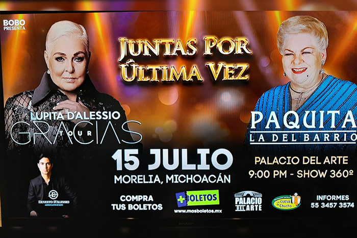 Redacción / La Voz de Michoacán Morelia, Michoacán. El público moreliano verá juntas a Lupita D’Alessio y Paquita la del Barrio este sábado 19 de agosto en el Palacio del Arte de Morelia, luego de que el concierto fuera reprogramado. Bobo Producciones dio a conocer que el show 360 grados “Juntas por última vez” no se llevaría a cabo el próximo 15 de julio sino hasta el 19 de agosto. Aunque ambas divas de la música son parte del mismo espectáculo, cada una actuará por separado, así se informó cuando se dio a conocer el evento. La empresa justificó la espera debido a que “es de vital importancia presentar un concierto que cumpla con los estándares de la más alta calidad, para poder realizar el show como el público lo merece”. Además, esta presentación en la capital michoacana marcará el adiós de los escenarios de la llamada “Leona dormida”, luego de 52 años de exitosa carrera artística. En la plataforma digital www.masboletos.mx aún hay disponibilidad en algunas secciones. La zona Bronce tiene disponibilidad con un precio de $937.80. En tanto que en la Oro $2,920; en Platino ($3,269.80) y en mesas VIP, de $10,280.80. De esta manera, los fans esperarán nueva fecha para poder cantar con la D’Alessio temas como “Mudanzas”, “Acariciame”, “Ni guerra ni paz”, “Inocente pobre amiga”,”Ese hombre”, “No preguntes por quién”, “Tú ni te imaginas”. Y con Paquita La del Barrio desgarrarse la garganta con canciones como “Rata de dos patas” “Cheque en blanco”, “Hombres malvados”, “Viejo rabo verde”, “Pobre pistolita” y “Que me perdone tu perro”.