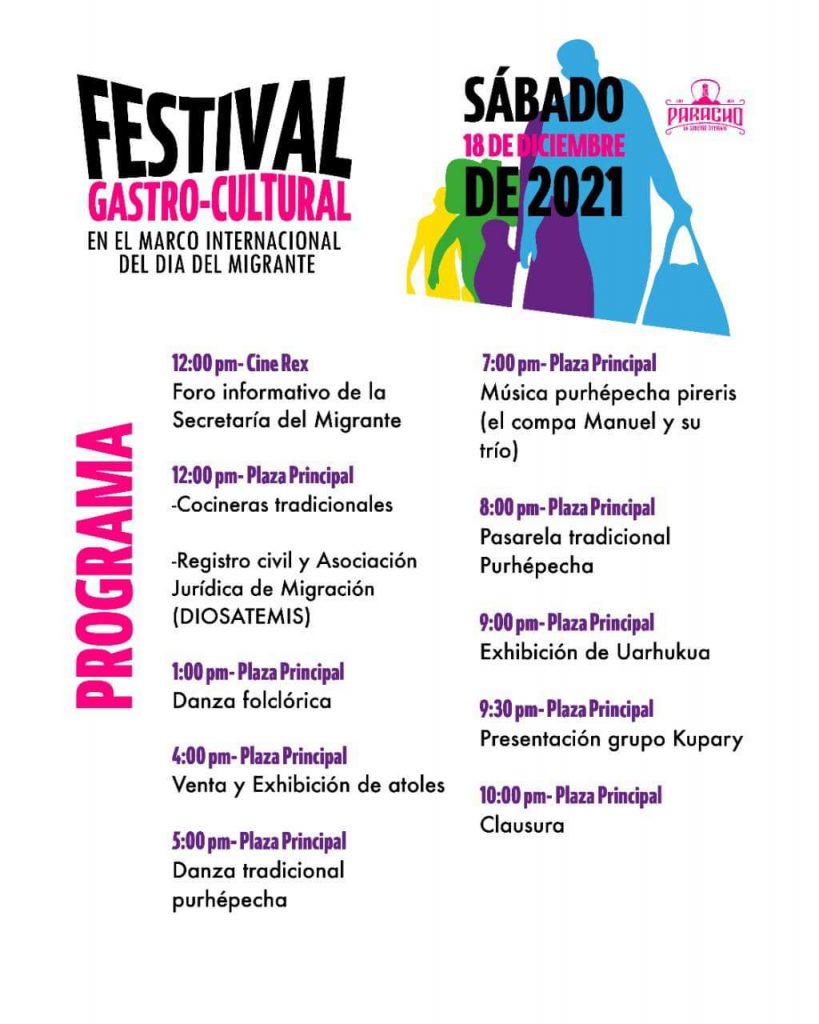 Este festival se hace en el marco del Día Internacional del Migrante, y aprovechando la visita de nuestros paisanos,  se realizarán actividades por parte de la Secretaria del Migrante y de asociaciones jurídicas de de migración, para apoyar a los migrantes sobre temas o asuntos que tengan pendientes, y brindarles información sobre tramites a realizar.