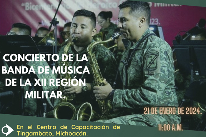 Morelia, Michoacán. La Secretaría de la Defensa Nacional, a través del Comandancia de la 21/a. Zona Militar en coordinación con el Gobierno Municipal de Tingambato, invitó al público en general para asistir a las festividades del día domingo 21 de enero. En este evento, la renombrada Banda de Música de la XII Región Militar, ofrecerá un espectacular concierto musical en conmemoración a las festividades del Municipio de Tingambato Michoacán.