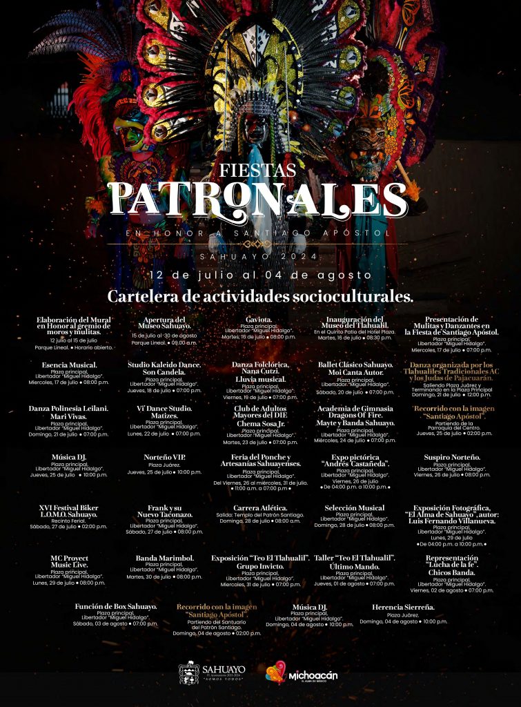Redacción / La Voz de Michoacán Sahuayo, Michoacán. Invitan a las Fiestas Patronales en Honor a Santiago Apóstol en el municipio de Sahuayo, donde contarán con presentaciones artísticas, música en vivo y peregrinaciones religiosas. Este gran evento se realizará del viernes 12 de julio al domingo 4 de agosto, según dieron a conocer el Secretario de Turismo de Michoacán, Roberto Monroy García; el presidente municipal de Sahuayo, Manuel Gálvez Sánchez y el director de la Secretaría de Turismo, Christian Fabian Ochoa Arceo en rueda de prensa. Foto: Samuel Herrera Jr. Entre las actividades artísticas de estas fiestas se encuentra la apertura del Museo del Tlahualil en el Quinto Patio del Hotel Plaza el martes 16 de julio a las 20:30 horas, la inauguración de la exposición pictórica “Andrés Castañeda” en la plaza principal Libertador Miguel Hidalgo el viernes 26 de julio a las 16:00 horas y la apertura del Museo Sahuayo en el Parque Lineal a partir del jueves 15 de julio a las 09:00 horas. Así mismo, habrá otras exposiciones fotográficas y pictóricas, así como la presentación de grupos de danza folklórica, ballet, contemporánea y polinesia que se llevarán a cabo en la plaza principal de la localidad. Otras de las actividades serán una presentación de box, el Festival Biker, una carrera atlética y una función de box. Los días jueves 25 de julio, lunes 29 de julio y domingo 4 de agosto se presentarán DJ Sets en la plaza principal Libertador Miguel Hidalgo, mientras que el viernes 26 de julio y se presentará Suspiro Norteño, el jueves 25 de julio Norteño VIP y el martes 30 de julio la banda Marimbol. Finalmente, el domingo 21 de julio a las 14:00 horas se presentará la danza organizada por los Tlahuiles Tradicionales y los Judas de Pajacuarán partiendo desde la Plaza Juárez hasta llegar a la plaza principal.