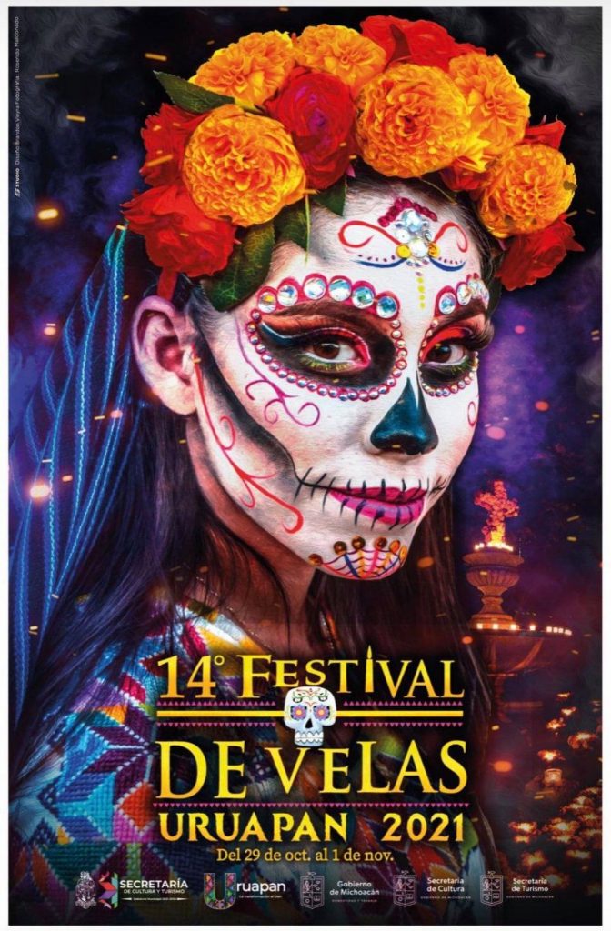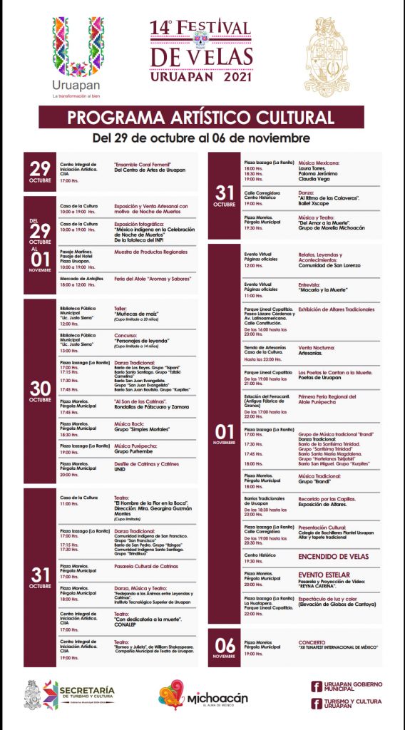 Redacción / La Voz de Michoacán Morelia, Michoacán. Este martes, el municipio de Uruapan presentó la imagen y el programa del 14 Festival de Velas en Uruapan que se realizará del 29 de octubre al 1 de noviembre, con el fin de reactivar la economía ante la crisis que presenta todo el país debido a la pandemia del Covid-19. La secretaria municipal de Turismo y Cultura, María Concepción Ramírez Sámano, oficializó la reactivación del citado festival, ello durante la reciente reunión con la mesa directiva de la Cámara Nacional de Comercio, Servicios y Turismo de Uruapan (canaco-Servytur) en la que adelantó que igualmente se alistan otras actividades para las celebraciones de fin de año, luego de que también durante los dos últimos dos años no se han realizado actividades masivas. Foto: Facebook El 14° Festival de Velas de Uruapan es una celebración reconocida como Patrimonio de la Humanidad que es íntimamente tradicional además de festiva. Durante estos días una marea de creatividad recorre todo Uruapan, que se engalana para recibir a los que se fueron para siempre. En el caso concreto del Festival de Velas 2021, serán actividades que se realizarán del 29 del presente a 1 de noviembre próximo, periodo en que grupos de danza y teatro tanto de la Casa de la Cultura, así como de grupos organizados de la sociedad civil, realizarán algunas presentaciones en diversos escenarios principalmente del centro de la ciudad, lo que incluirá una pasarela de la “reina catrina”. Desde luego, estos eventos, tendrán su mayor representación la noche del 1 de noviembre, lo que incluirá el evento principal que se refiere al encendido de velas, el cual en esta ocasión solamente contemplará entre 30 mil y 40 mil pequeñas candelas sin la búsqueda de establecer un nuevo record por arriba de las 55 mil unidades utilizadas en la edición 2019, pues en el 2020 no se realizó evento alguno por las restricciones de la emergencia sanitaria. Es esta ocasión la difusión será solamente regional pues por el momento, las restricciones sanitarias obligan a la prudencia para evitar atraer a grandes cantidades de visitantes, señaló por su parte el Director de Turismo, Javier Espinosa Foto: Facebook