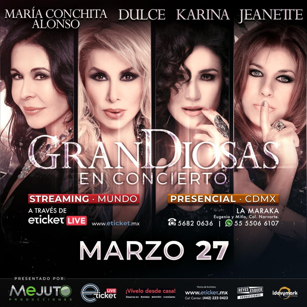Enrique Santiago / La Voz de Michoacán Morelia, Michoacán. La pandemia ha alejado de la vida diaria los conciertos en vivo, pero eso no ha sido impedimento para que los cantantes se acerquen a su público. Tal es el caso más reciente del éxito rotundo de Gloria Trevi con su streaming internacional presentado en días pasados. Ahora es el turno al exitoso concepto musical ‘GranDiosas’, creado por Hugo Mejuto, que presentará un elenco multiestelar e internacional, tanto de manera presencial en ‘La Maraka’, un centro de espectáculos de la Ciudad de México, como vía streaming a través de la plataforma Eticket, el próximo sábado 27 de marzo. Así, la versión 2021 de este show estrena una GraDiosa. Con grandes éxitos como: ‘Soy rebelde’, ‘Porque te vas’, ‘Frente a frente’, ‘El muchacho de los ojos tristes’ y ‘Corazón de poeta’, la cantante Jeanette, por primera vez en toda su historia musical, se presentará en show en tierras aztecas y nada menos que en este espectáculo tan bien recibido por el público mexicano. María Conchita Alonso Dulce Karina Jeanette Definitivamente, ¡No te las puedes perder! Te dejamos el enlace para que adquieras tus boletos. eticket/granDiosas