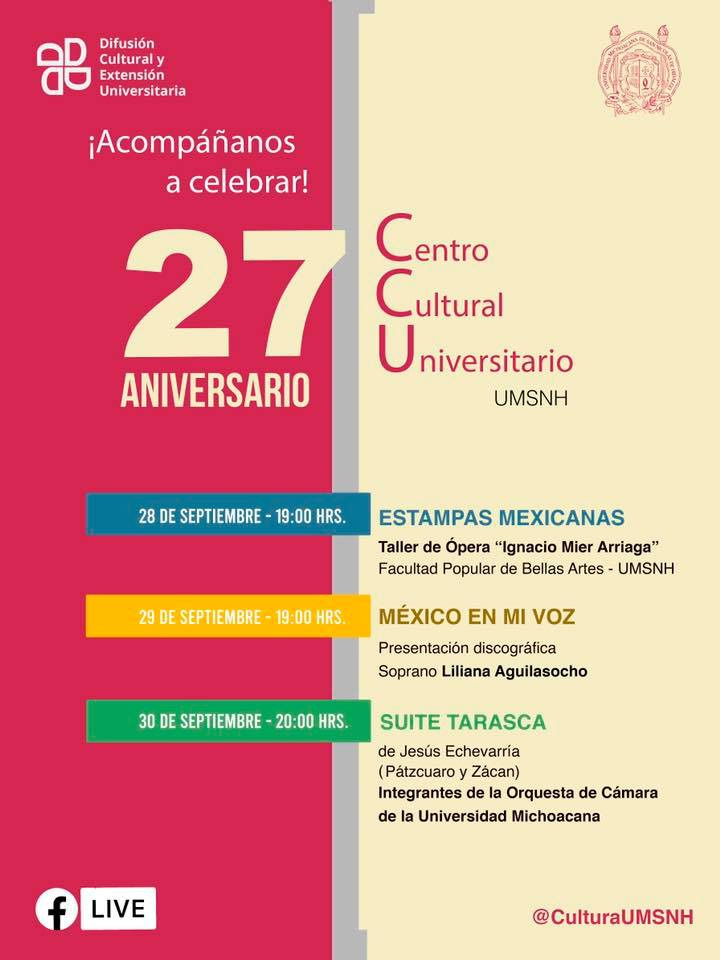 Enrique Santiago / La Voz de Michoacán Morelia, Michoacán. Este jueves 24 de septiembre el Centro Cultural Universitario de la Universidad Michoacana de San Nicolás de Hidalgo cumple 27 años de su fundación. Este aniversario cae en medio de la pandemia por COVID-19, pero la Secretaría de Difusión Cultural y Extensión Universitaria tiene listo un festejo en tres actos que podrás disfrutar conectándote a los eventos en vivo a través de Facebook. Las condiciones para celebrar este mismo día los 27 años del Centro se complican al estar cerradas nuestras puertas, pero a pesar de eso preparamos una fiesta virtual, una fiesta digital en esos nuevos espacios imaginarios cuando no podemos utilizar este maravilloso recinto, así que están invitados a través de nuestras transmisiones en vivo en la cuenta de FacebookAurora Molina Pineda, jefa de departamento del Centro Cultural Universitario Los eventos tendrán como marco el majestuoso recinto universitario y los tres son de un nivel de calidad digno de esta celebración. Lunes 28 de septiembre Concierto “Estampas mexicanas” El Taller de Ópera Ignacio Mier Arriaga de la Facultad Popular de Bellas Artes, conformado por nueve estudiantes y dirigido por el maestro Salvador Ginori, ofrecerá un recital con un repertorio será música regional mexicana. Conéctate a las 19 horas. Martes 29 de septiembre "México en mi voz" La soprano moreliana Liliana Aguilasocho, egresada del Conservatorio de las Rosas; ganadora del concurso Artescénica, tercer lugar en el Concurso Francisco Araiza e integrante del Estudio de Ópera de Bellas Artes, presentará su más reciente producción discográfica “México en mi voz”. Conéctate a las 19 horas. Miércoles 30 de septiembre "Suite Tarasca" La Orquesta de Cámara de la Universidad Michoacana (OCUM) está de regreso para cerrar con broche de oro la celebración, presentando su primer concierto en línea. La Suite Tarasca de Jesús Echevarría. Conéctate a las 20 horas. Te dejamos el link para que no te pierdas estos eventos. https://www.facebook.com/centroculturaluniversitarioUMSNH