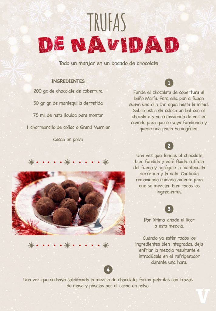 Agencias / La Voz de Michoacán La época navideña es el momento perfecto para animarse a jugar con el chocolate en casa. Las bajas temperaturas ayudan a manejarlo mejor y podemos pasar un rato divertido y deliciosamente pringoso en buena compañía, a la vez que preparamos un rico detalle para regalar en las fiestas. Si los mendiants no fallan, las trufas de chocolate caseras son otro acierto seguro para los amantes del cacao. Estos antojitos son parte de las preparaciones de chocolate de mayor consumo en estas fechas y si bien son de origen francés se les puede encontrar en muchas partes. En México las podrán encontrar en muchas chocolaterías y tiendas gourmet. Prepara tus trufas de Navidad Ingredientes: - 200 gr. de chocolate de cobertura - 50 gr. de mantequilla derretida - 75 ml. de nata líquida para montar - 1 chorreoncito de coñac o Grand Marnier - Cacao en polvo Preparación: Funde el chocolate de cobertura al baño María. Para ello, pon a fuego suave una olla con agua hasta la mitad. Sobre esta olla coloca un bol con el chocolate y ve removiendo de vez en cuando para que se vaya fundiendo y quede una pasta homogénea. Una vez que tengas el chocolate bien fundido y esté fluido, retíralo del fuego y agrégale la mantequilla derretida y la nata. Continúa removiendo cuidadosamente para que se mezclen bien todos los ingredientes. Por último, añade el licor a esta mezcla. Cuando ya estén todos los ingredientes bien integrados, deja enfriar la mezcla resultante e introdúcela en el frigorífico durante, al menos, una hora. Transcurrido el tiempo mencionado, y una vez que se haya solidificado la mezcla de chocolate, forma pelotitas con trozos de masa y pásalas por el cacao en polvo.De esta manera tendrás listas tus trufas de Navidad en poco tiempo. Trucos y Consejos También puedes pasar las trufas por virutas de chocolate, coco rallado o azúcar glass. Además, estos dulces de Navidad pueden convertirse en un estupendo obsequio si los presentas en una bonita caja de cartón decorada. Información Nutricional Estos dulces de Navidad son ricos en calorías y grasas saturadas, ya que incluyen mantequilla, chocolate y nata. Por ello, conviene consumirlos de forma esporádica, sobre todo si se tienen niveles elevados de colesterol y de azúcar en sangre. También se aconseja consumir estas trufas como complemento de una dieta rica en verduras y cereales integrales, para que el impacto de los azúcares en el organismo no sea demasiado brusco.