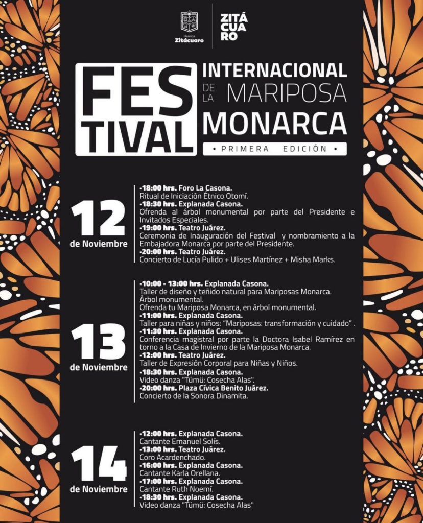 Redacción / La Voz de Michoacán Zitácuaro, Michoacán. Autoridades municipales de Zitácuaro, encabezadas por el alcalde, Juan Antonio Ixtláhuac, dieron a conocer que llegará a Michoacán el primer Festival Internacional de la Mariposa Monarca, que traerá varias actividades para toda la familia, como eventos artísticos, culturales, conferencias y el nombramiento de la embajadora de la Mariposa Monarca. El festival se realizará del 12 al 14 de noviembre y tendrá distintas sedes dentro del municipio de Zitácuaro, la Casona de la Estación, el Teatro Juárez y la plaza cívica Benito Juárez, son algunas de ellas. Foto: Víctor Ramírez El presidente municipal, Juan Antonio Ixtláhuac, detalló que el objetivo de este festival es reactivar el turismo para fortalecer la economía de la región mediante la apertura de un santuario para la Mariposa Monarca, en el Cerro Cacique y en el Cerro Pelón, y así mismo, proteger los recursos naturales, pues la pandemia provocada por el virus de COVID-19 y la tala de árboles, ha puesto en peligro a los santuarios de la mariposa y la economía misma. “Lanzamos un llamado para que se abran los santuarios de la Mariposa Monarca, si no se abren, estaremos viviendo una gran tala clandestina, porque los santuarios hacen que se cuiden los bosques, y mejor que la gente viva del turismo y preservación del bosque, que se sepa que hay recursos para cuidarlos y no deforestarlo”, detalló a medios de comunicación el presidente municipal. “No tenemos alternativa, el gobierno municipal debe enaltecer aquellas fortalezas como son las riquezas naturales que tenemos, en este sentido organizaciones internacionales han nombrado a la mariposa monarca como patrimonio natural de la humanidad”, agregó el edil. Fue Georgette Ángeles Victoria, titular de Desarrollo Social y Rural, quien puntualizó las actividades que se realizarán durante el festival, entre las que destacan la ofrenda al árbol monumental, un concierto con Lucía Pulido, Ulises Martínez y Misha Marks y un taller de diseño y teñido de la Mariposa Monarca. Foto: Víctor Ramírez Además, también se dijo que este primer festival contará con personajes importantes, entre los que destacan la embajada de Estados Unidos y Canadá. Cabe destacar que el evento se realizará bajo todas las medidas sanitarias indicadas por la Secretaria de Salud, por lo que el uso de cubrebocas será de manera obligatoria, así como el uso constante de gel antibacterial y respetar la sana distancia. No te pierdas este importante primer Festival Internacional de la Mariposa Monarca, en el que podrás disfrutar de la maravilla de la naturaleza. Programa del primer Festival Internacional de la Mariposa Monarca: Foto: Twitter / @correorealmx