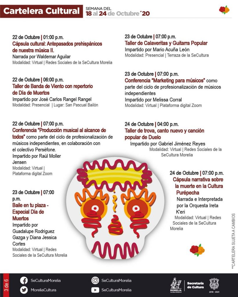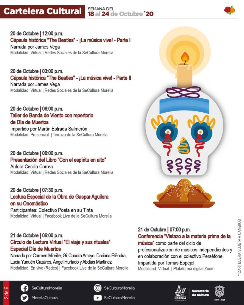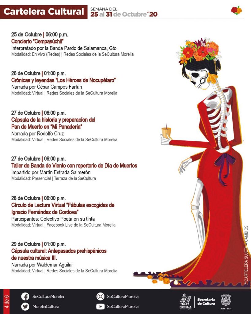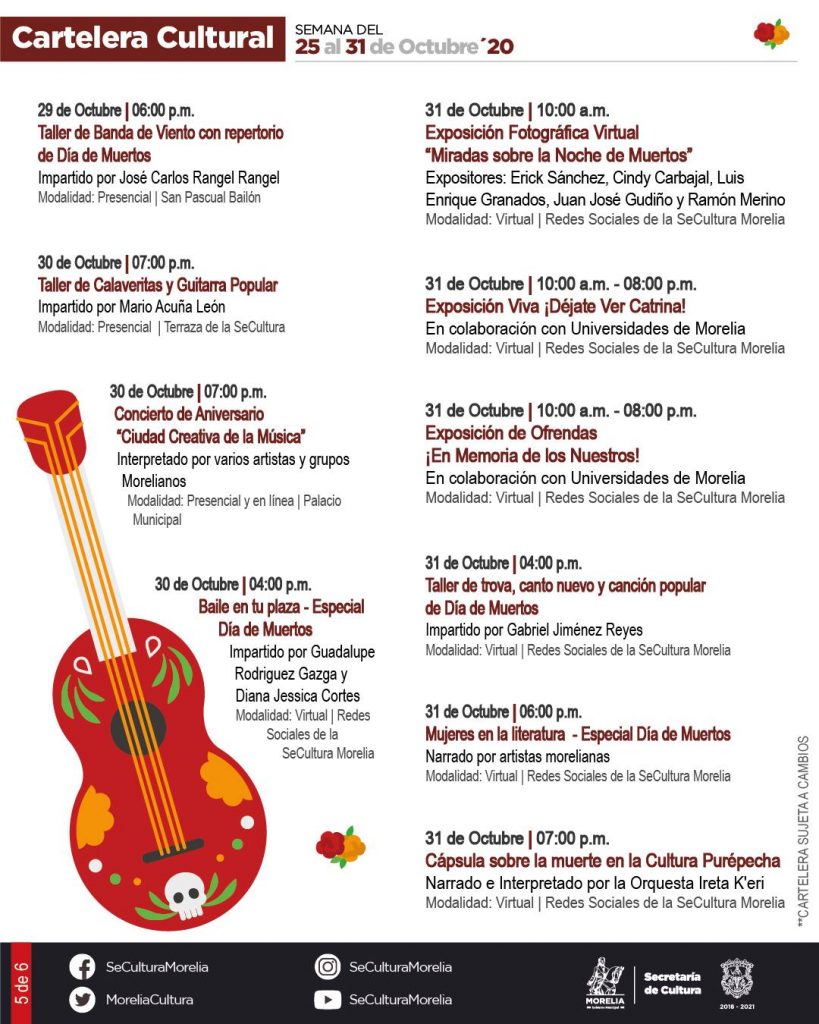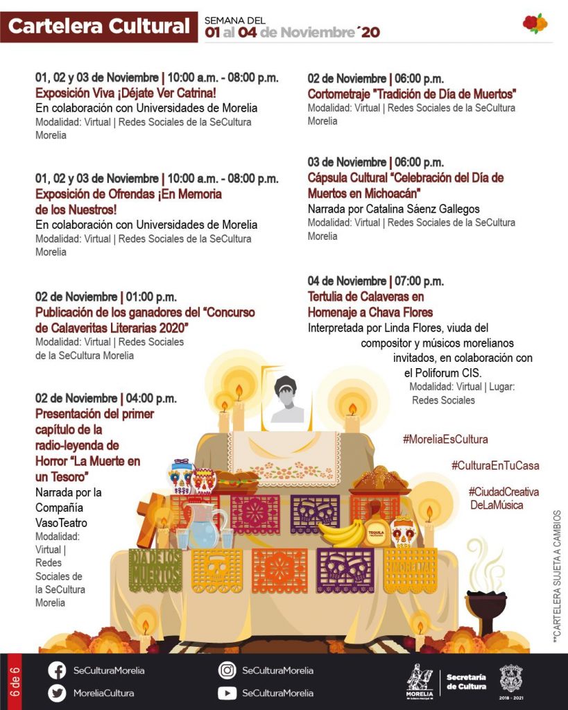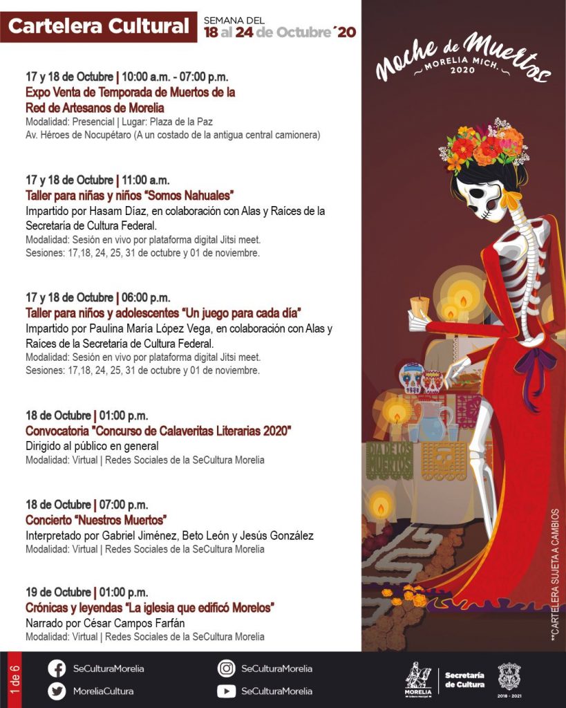 Redacción / La Voz de Michoacán Morelia, Michoacán. La Secretaría de Cultura de Morelia presentó la Cartelera Cultural para la Noche de Muertos de 2020, que incluye actividades presenciales y virtuales, estas últimas que serán transmitidas a través de sus redes sociales. Este año, la temporada de noche de muertos inicia con actividades presenciales como la Expo Venta de Artesanos, los Talleres Artísticos Comunitarios y el Concierto por el 3er. Aniversario del nombramiento de "Morelia Ciudad Creativa de la Música". A través del programa Cultura En Tu Casa se realizarán diversas actividades tradicionales como la Exposición Viva ¡Déjate Ver Catrina!, la Exposición de Ofrendas ¡En Memoria de los Nuestros!, el Concurso de Calaveritas Literarias, la Exposición Fotográfica Virtual "Miradas sobre la Noche de Muertos", la presentación del Cortometraje "Tradición de Día de Muertos" y la Tertulia de Calaveras en Homenaje a Chava Flores, entre otros. La Secretaría de Cultura de Morelia invitó a las personas a que, a la par de estas actividades, mantenga viva la tradición de las celebraciones de Noche de Muertos desde casa, para reducir los contagios por COVID-19. También la puedes consultar aquí