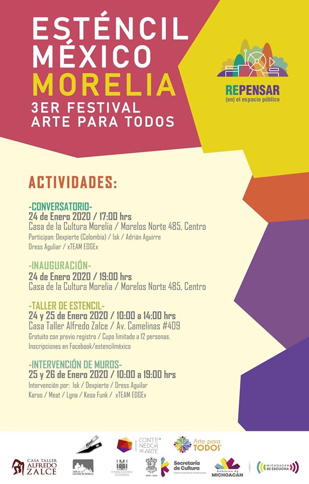 Redacción/La Voz de Michoacán Morelia, Michoacán. El Festival Arte para Todos en su tercera edición anuncia la llegada de "Esténcil México" a Morelia con una serie de talleres totalmente gratis e intervenciones de muro que seguro a más de un moreliano debe interesarle. Para ingresar a dichos talleres debes de enviar un inbox a este enlace. ¿Qué es el "stencil" o esténcil? Stencil (en español lo encontraremos como “esténcil” o “estarcido”) es la técnica de pintar con una plantilla. Usado desde el arte rupestre (practicado en la roca de las cavernas), se ha impuesto a lo largo de la historia fundamentalmente para decoración (para decorar con patrones de diseño, con imágenes repetitivas). En la plantilla se recorta el dibujo o el patrón de diseño (dejando un vacío equivalente a la imagen a obtener). La plantilla se apoya entonces contra otra superficie y se aplica pintura. Al retirarse la plantilla, queda sobre la superficie de abajo la imagen deseada (el resto de la pintura, lo que “sobra”, queda en la plantilla). ¿Qué sigue para el Festival "Arte para todos"? Tras advertir que toda la semana se estuvo en el espacio público de la Calle Peatonal Nigromante, sin autorización municipal, inició la última de las mesas interactivas del Festival “Arte para todos” (Re) Pensar Colectivamente (en) el Espacio Público, dedicada a la reflexión respecto al Feminismo y las Nuevas Masculinidades. Este encuentro busca mostrar las posibilidades del espacio público caminable, seguro y agradable, como punto de encuentro entre diferentes actores sociales por medio del arte visual, instalaciones, performance, acciones, arte y entorno. Rubén Rodríguez Leal, Luis Alberto Juárez Montoya, Estrella López Maciel, Pedro Alberto Carreón Ramos y Tzitziki Erandeni Ávalos Ortiz, moderados por la presidenta de la Asociación Civil Contenedor de Arte; nos ofrecieron cinco perspectivas diferentes, desde sus diversas experiencias y campos de trabajo, reunidos para compartir conceptos, interpretaciones, procesos de construcción de relaciones familiares, sociales y con nosotras o nosotros mismos. El punto de partida: ¿Qué carajos es el feminismo?, que a decir de Tzitziki, abogada feminista, más allá de la teoría “es una forma de vivir, pensar, sentir, gozar la vida de la misma manera de que los hombres lo pueden hacer”. Reconoció que en nuestro contexto el ser feminista se aprecia como un movimiento agresivo o violento, “porque cuando nos mostramos como feministas, lo primero que hacen es excluirnos, no podemos hablar de derechos sexuales ni reproductivos, sin que piensen que haremos atrocidades”. El feminismo es una manifestación y una necesidad ante los dichos como ‘calladitas nos vemos más bonitas’; te permite ver por qué somos diferentes y cómo en cada cultura, espacio, país, tiempo, se nos construyen diferente, nos anula en expresión hasta el punto de ser discriminadas, excluidas e inclusive violadas, consideró.