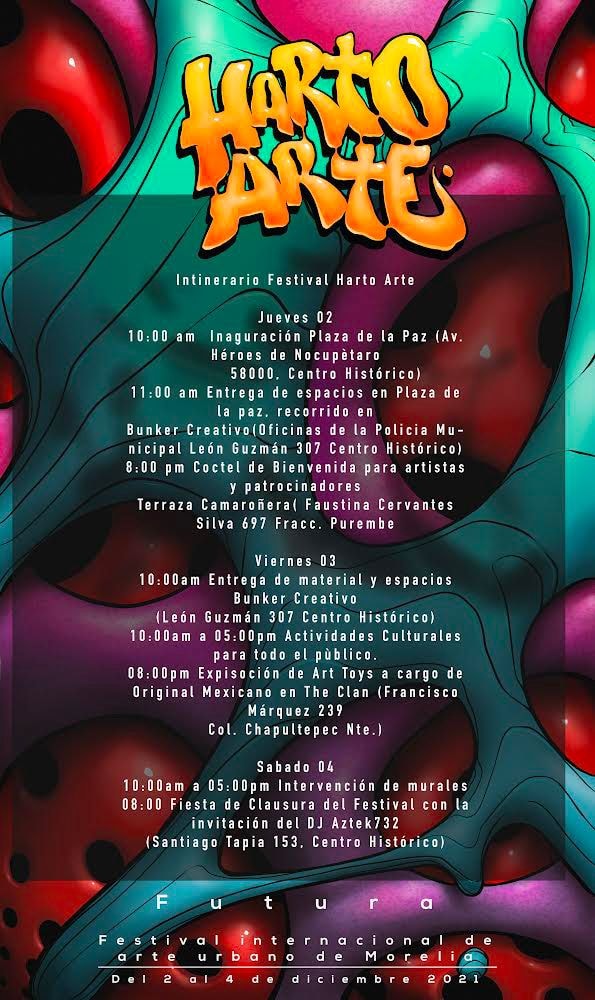 Redacción / La Voz de Michoacán Morelia Michoacán. El día de hoy da inicio la tercera edición del Festival Internacional de Arte Urbano de Morelia “Harto Arte”, en el que las calles de Morelia se llenarán de colores, formas, expresión y talento, en donde además, habrá muchas actividades culturales y artísticas completamente gratuitas para chicos y grandes. Este festival tiene como propósito crear una galería de gran formato dentro de la cuidad, recuperar los espacios públicos que se han abandonado o que han quedado al olvido, para devolverles brillo, color y luz, a través de la expresión de varios artistas urbanos, ilustradores y diseñadores de la cuidad de Morelia, de otros estados del país y hasta de otras partes del mundo. Foto: Facebook / @futuraac. Entre las actividades que se llevarán a cabo durante el festival, se encuentra la realización de varias actividades culturales a las que podrá asistir el público en general y las cuales no tendrán costo alguno, además de exposiciones y la intervención de murales dentro de la cuidad. Foto: Facebook / @futuraac. Harto arte contará con la participación de varios artistas invitados, como Drain Myster, Zreo, Ale Poire, Grek Gohan, Afor, Adrianagarcidueñas, Ceci Seoane, Fixe, Metzican, Ahani H, Analucia, Resoe y muchos artistas más. Las actividades se llevarán a cabo hasta el 4 de diciembre en varios puntos de la cuidad de Morelia y todas se irán compartiendo durante esta semana por medio de las redes sociales del festival. Foto: Facebook / @futuraac. Harto Arte se hace con el apoyo de la asociación Futura AC, que “tiene como objetivo generar proyectos que afecten positivamente a la sociedad en y en lo particular a los jóvenes”. programación Foto: Facebook / @futuraac.
