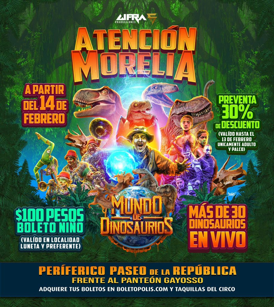 Redacción / La Voz de Michoacán Morelia, Michoacán. A partir del 14 de febrero hasta el 3 de marzo, el espectáculo del mundo de la época jurásica estará caminando en vivo para la audiencia, con más de 35 dinosaurios en vivo, habrá variedad de funciones estelares y una carpa ambientada en la Eera Mesozoica. Ubicados en el Periferico paseo de la República, frente al panteón Gayosso, ya están instalados para comenzar con los shows planeados para este mes de febrero. Foto: Redes ¿Qué funciones habrá? De lunes a jueves a las 7:30 Viernes y sábado a las 6:00 y 8:30 Domingos a las 12:00, 4:00 y 7:00 ¿Qué costos tendrán las entradas? Puedes adquirir tus boletos en preventa hasta el 13 de febrero con un 30% de descuento, esta promoción solo es para adultos y palcos. Niños: $100 Luneta adulto: $200 Preferente adulto: $300 Palco para 4 personas: $2,000 Los boletos pueden comprarse en taquillas del circo en la página: http://mundodinosauriosmorelia2.boletopolis.com
