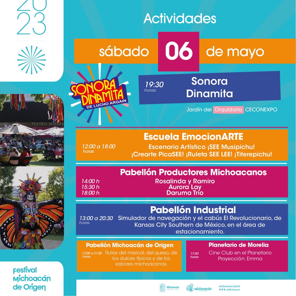 Redacción / La Voz de Michoacán Morelia, Michoacán. En el segundo fin de semana de conciertos en el Festival Michoacán de Origen 2023, en el Centro de Convenciones de Morelia, esta noche será de cumbia al ritmo de La Mejor Sonora Dinamita de Lucho Argaín. Esta agrupación, que difunde el folklore colombiano y la música tropical, pondrá el sabor en los jardines del Orquidario con temas como “El viejo del sombrerón”, “Oye”, “Escándalo”, “Mi cucú”, “Capullo y sorullo”. El concierto está programado a partir de las 7:30 de la noche en el espacio que tiene cupo limitado, por lo que se invita a quienes deseen asistir a que lleguen temprano para asegurar un lugar. Ayer se presentaron la cantante sinaloense Carolina Ross y el oriundo de Guerrero, Cuitla Vega, jóvenes promesas del regional mexicano, así como del pop romántico. Mañana el Festival Michoacán de Origen se engalanará con la actuación de Jesse & Joy. ¿QUÉ MÁS HABRÁ HOY EN EL FESTIVAL? Las actividades para este 6 de mayo en el escaparate michoacano también incluye el Cine Club en el Planetario, con la proyección de la película Emma, a las 17:00 horas. También está la Escuela EmocionARTE, con escenario artístico, SEE Musipichu, Crearte PicaSEE, Ruleta SE LEE y TiterePichu. Asimismo, en el Pabellón Industrial está el simulador de navegación y el cabús “El Revolucionario”, de Kansas City Southerm de México, en el área de estacionamiento. En cuanto a cartelera cultural, en punto de las 18:00 horas, en la explanada del Teatro Morelos, se presentará Lindero de Tierra Caliente de Michoacán.