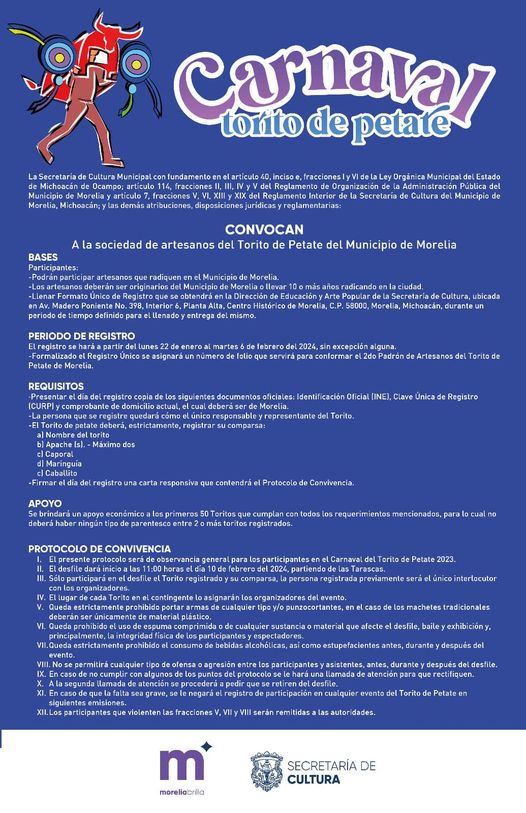 La Secretaría de Cultura del Ayuntamiento de Morelia, abrió este lunes la convocatoria que estará disponible de hoy 22 de enero hasta el 6 de febrero.