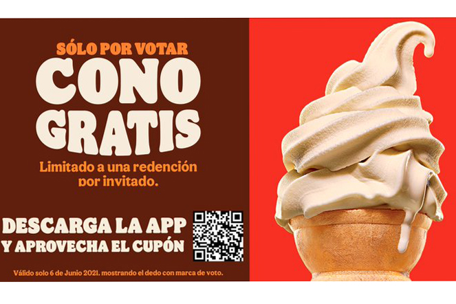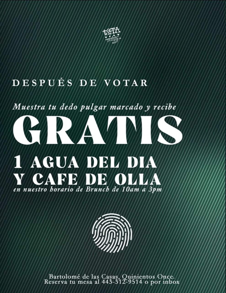 Enrique Santiago / La Voz de Michoacán Este 6 de junio lo primero es ejercer tu voto responsablemente y después a disfrutar de las promociones que los comercios locales han dispuesto para los ciudadanos que muestren su pulgar con la marca de la democracia. En las sucursales de Burger King a manera de impulsar e invitar a las personas a que emitan su voto, la gran franquicia de la hamburguesa está regalando un cono de helado gratis al mostrar que ya votaste. A votar ? y disfrutar ?. Ve a tu BK más cercano luego de votar, descarga el cupón de nuestra app y llévate una dulce recompensa?. pic.twitter.com/HsZlrjt1jt— burgerkingmx (@BurgerKingMX) June 6, 2021 Mazunte es una cafetería que ofrece una gran variedad de jugos de temporada y tradicionales tortas, este establecimiento anunció a través de sus redes sociales "But First, ¡a votar!" una dinámica para regalar un café americano al mostrar que votaste. En CHANGO, ubicado en Sor Juana Inés de la Cruz No. 129 en el Centro de Morelia te espera café y pan de origo GRATIS al mostrar que ya votaste. A nivel nacional, la cafetería Vips también te tiene una dulzura, si muestras tu pulgar con la tinta indeleble clásica de las votaciones de México. En Morelia, hay tres sucursales donde puedes acudir: en La Huerta, en Las Américas y en el Centro. Tata Mezcalería siempre atento a los acontecimientos importantes te refrescan con un agua del día y un café de olla al demostrar que ya ejerciste tu derecho democrático. Por si andas en el rumbo de Las Américas, Bisquets Obregón ofrece un descuento del 10% en las cuentas individuales al enseñar el pulga marcado. Estas son solo unas opciones pero son muchos los comercios que te "apapacharán" tras ejercer tu derecho a votar.