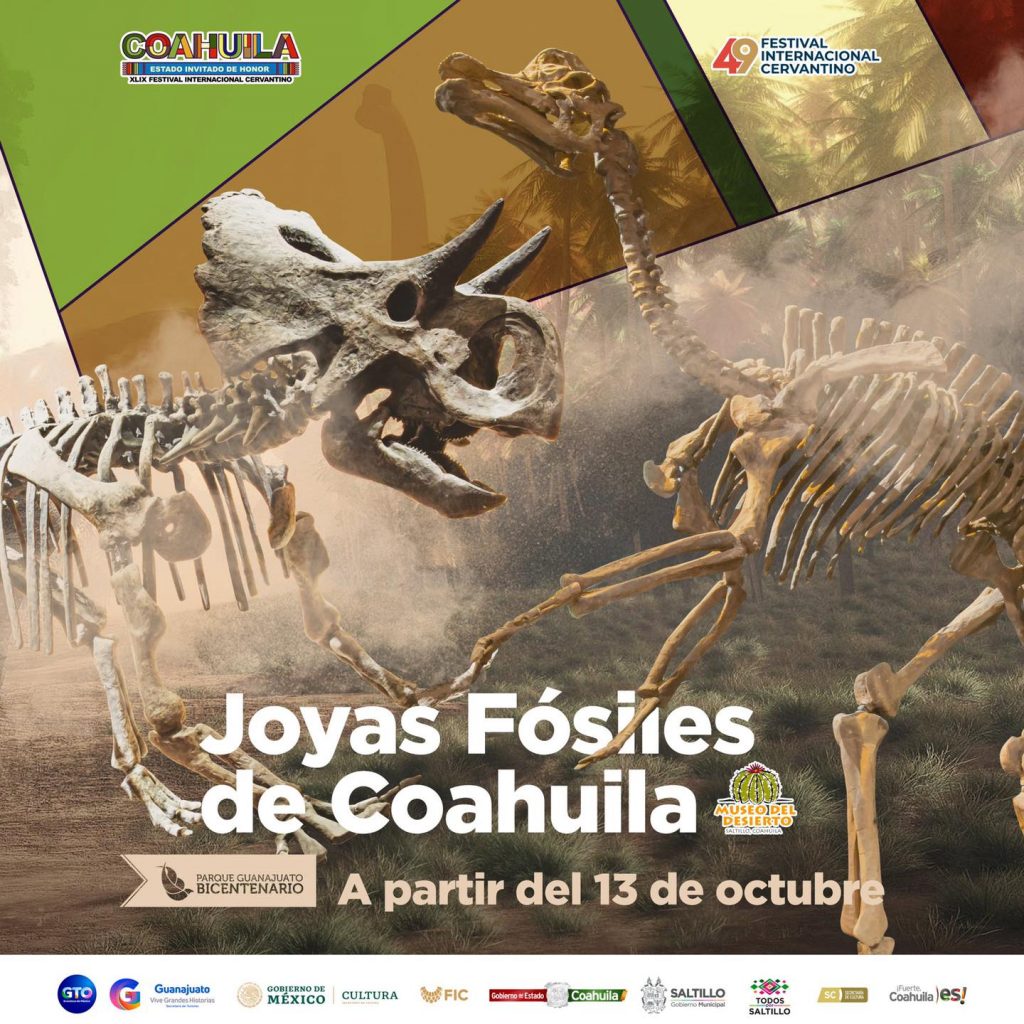 Silao, Guanajuato. En el marco de la edición número 49 del Festival Internacional Cervantino en Guanajuato, se exhibe una poderosa y gran colección de dinosaurios llamada Joyas Fósiles de Coahuila, que se está realizando con el apoyo de la Secretaria de Cultura del estado y que podrás disfrutar hasta el 31 de octubre.