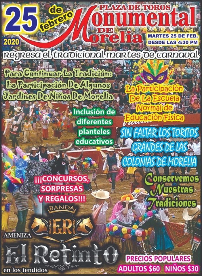 Redacción/La Voz de Michoacán Morelia, Michoacán. Este martes tendremos de regreso el tradicional “Martes de Carnaval” que se celebra año con año en la Plaza de Toros Monumental de Morelia donde instituciones de Morelia y pequeños participan con su tradicional toro de petate. En el evento habrá un concurso, sorpresas y regalos para todos los participantes del evento, podremos ver la participación de la Escuela Normal de Educación Física, el conmovedor numero de distintos jardines de niños de Morelia y escucharemos en vivo a la banda “El Retinto”. ¿Dónde y cuánto? La entrada a este evento será de $60 pesos para adultos y $30 para niños a partir de las 4 de la tarde en la Plaza de Toros Monumental de Morelia. Además, como ya es tradición la participación de los Toros de Petate de las Diferentes Colonias de Morelia y en distintos municipios de Michoacán. Tarímbaro, Charo y copándaro son los municipios favoritos y más visitados para celebrar este martes de carnaval entre toritos de petate, una gran variedad gastrónomica, mucho ambiente y mucho baile. En Tarímbaro los más distintivos toritos ya se encuentran en las calles llenas de baile y personas disfrutando de éste clásico carnaval.