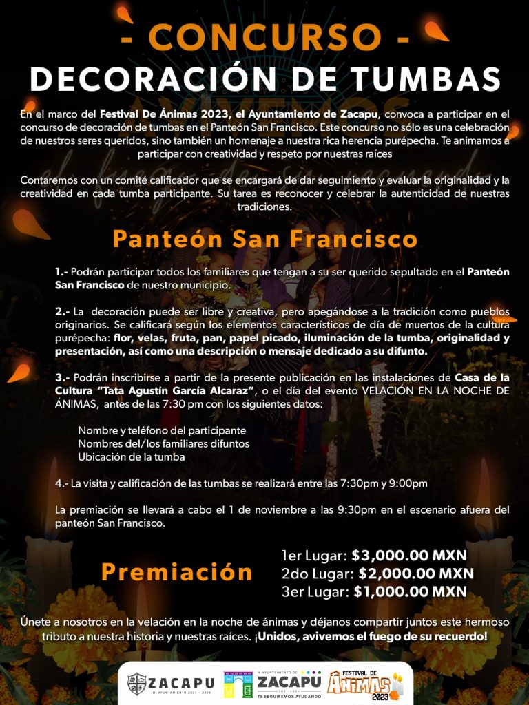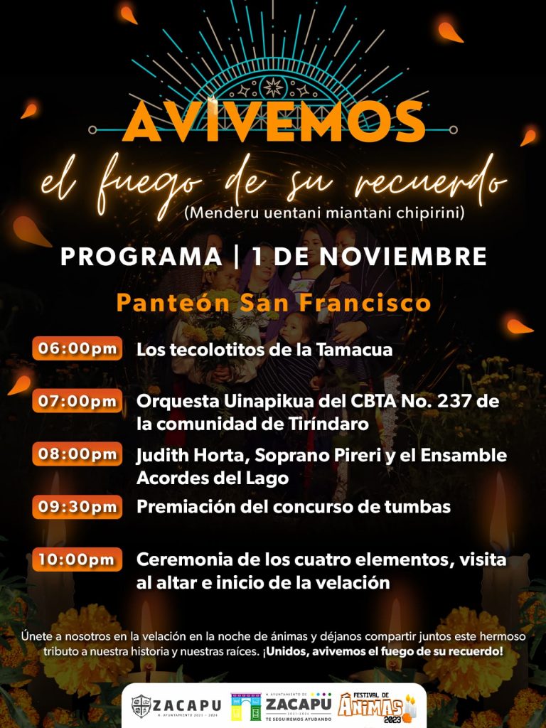 Redacción / La Voz de Michoacán Zacapu, Michoacán. En el marco del festival de Ánimas Zacapu 2023, se realizará el 1 de noviembre la "Velación" en los panteones municipales San Francisco y San Antonio, en un esfuerzo por rescatar esta tradición purépecha. Los purépechas celebran la vida después de la muerte, es decir, la muerte no representa una ausencia, sino a una presencia viva y es esta celebración la que fomentó que el Día de Muertos fuera catalogado como Patrimonio Inmaterial de Humanidad por la Unesco. La finalidad de realizar este “encuentro” entre los que ya no están pero regresan un día al año a convivir con su familiar, es retomar la tradición de que se reúnan las familias junto al que “regresa”, ofrecerle flores de cempasúchil, sal, agua y veladoras encendidas para darles "luz" a los difuntos, en sus tumbas. Por lo que para incentivar a la población, así como para rescatar la tradición purépecha de la velación, se realizará un concurso "simbólico". Para que el aroma de la flor de cempasúchil guíe a las almas de los difuntos en el camino hacia la ofrenda que les espera en el mundo de los vivos. Los panteones San Francisco y San Antonio, estarán repletos de esta flor naranja que trazan las rutas a las ánimas. Uno de los elementos que distinguirá a esta celebración en el panteón San Francisco, será el altar que se montará. Se trata de una construcción simbólica donde se colocan diversos elementos, con el objetivo de rendir tributo a los difuntos. Se colocarán tres arcos (Piririkua's), dos en el panteón San Francisco, uno a la altura de la primaria Melchor Ocampo y otro a la entrada del panteón y uno más en la entrada del panteón San Antonio. En el panteón San Francisco, circulación en la calle San Juan del Río entre río balsas y Artículo 27 Oriente estará cerrada desde el día domingo 29 de octubre hasta el 02 de noviembre. En el panteón San Antonio, estará cerrada la circulación el 01 de noviembre en las calles 18 de marzo a la del kinder de La Angostura. Actividades culturales y artísticas O1 de noviembre, panteón San Francisco. ? 6:00 pm pm Tecolotitos de la Tamacua- agrupación de la comunidad originaria de Tiríndaro que interpreta musica regional, sones, abajeños, musica purépecha y mucho más. ? 7:00 pm Orquesta de música UINÁPIKWA, que pertenece al Centro de Bachillerato Tecnológico Agropecuario (CBTA 237 ) de la comunidad de Tiríndaro. ? 8:00 pm Judith Horta – soprano interprete de pirekuas, acompañada de trio musical. ? 9:30 pm Premiación a las 3 mejores tumbas. ? 10:00 pm Ceremonia del fuego, saludo a los cuatro elementos a cargo de los barrios unidos de Zacapu. INICIO DE LA VELACION Invitación para que visiten el Altar Tradicional el cual estará en el descanso del panteón - Piririkhua. Por indicación del presidente municipal Lic. Luis Felipe León Balbanera, se implementará dispositivo de seguridad y prevención para salvaguardar la integridad de la población que asista a los panteones, habrá la presencia de guardia civil de Zacapu, Tránsito Municipal, protección civil municipal, rescate entre otros.