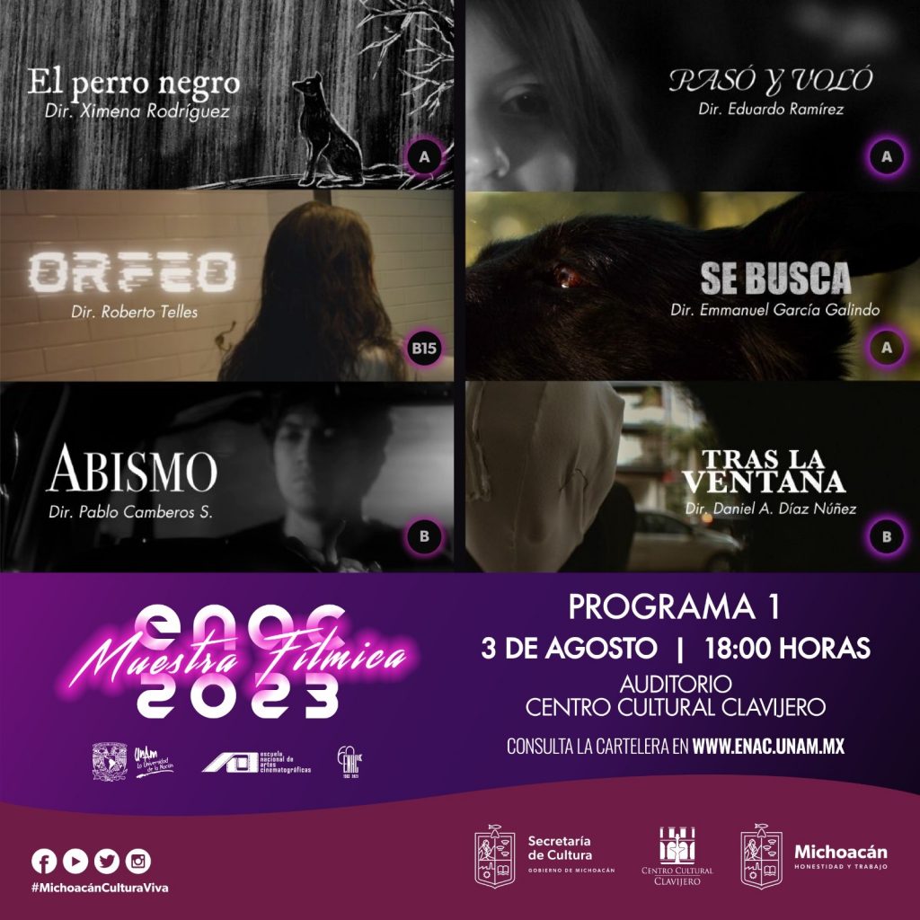 Redacción / La Voz de Michoacán Morelia, Michoacán. La Secretaría de Cultura de Michoacán (Secum), en colaboración con la Escuela Nacional de Artes Cinematográficas (ENAC), invitan a la exhibición de los trabajos más recientes y representativos estudiantes: la Muestra Fílmica 2023, que se presentará todos los jueves de agosto a las 18:00 horas en el Centro Cultural Clavijero (CCC). La titular de esta dependencia estatal, Tamara Sosa Alanís, reiteró su compromiso en el fortalecimiento del trabajo de las y los iniciadores en la cinematografía, como es el caso de estos trabajos que incluyen ejercicios fílmicos de ficción y documental, abordando temáticas diversas y disfrutando de una completa libertad creativa. Esta muestra contará con cinco programas de proyecciones de los trabajos de estudiantes de la escuela, a presentarse los días 3, 10, 17, 24 y 31 de agosto en un horario de 18:00 a 20:00 horas de manera gratuita, en el recinto cultural, ubicado en Nigromante 79, en el Centro Histórico de la capital michoacana. Los asistentes podrán disfrutar de los siguientes trabajos, durante el primer programa cinematográfico: “Abismo”, del director Pablo David Camberos Servín (clasificación B).“El perro negro”, dirigida por Ximena Rodríguez Juárez (clasificación A).“Orfeo”, del director Roberto Telles (clasificación B15).“Pasó y voló”, del director Eduardo Ramírez Torres (clasificación A).“Se busca”, bajo la dirección de Emmanuel García Galindo (clasificación A).“Tras la ventana”, del director Daniel Alejandro Díaz Núñez, (clasificación B). Finalmente, Sosa Alanís invitó a la población a disfrutar de estas vacaciones de verano con las diferentes actividades de la Secretaría de Cultura, mismas que podrán consultarse a través del siguiente link: https://bit.ly/453m2qA