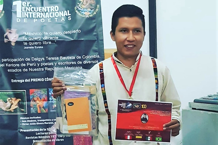 Querétaro, Querétaro. El poeta Jesús Armando Molina Quiroz, originario de Chilchota, en la Cañada de los Once Pueblos, recibió el premio Cóndor de Oro, durante su participación en el Encuentro Internacional de Poetas y Escritores, realizado en esta ciudad.