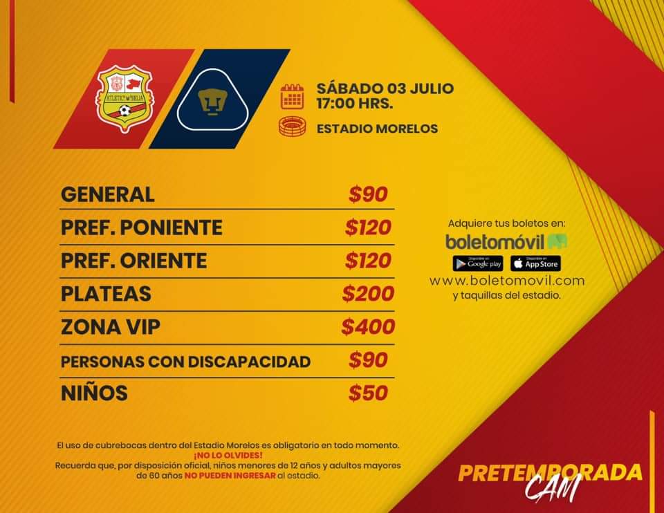 Redacción / La Voz de Michoacán Morelia, Michoacán. El Club Atlético Morelia dio a conocer los precios para el partido amistoso que jugará contra Pumas el próximo sábado 3 de julio en el Estadio Morelos, en la capital michoacana. La venta de boletos comenzará el lunes 28 de junio a través de la app de boletomóvil, la página www.boletomovil.com y en las taquillas del Coloso del Quinceo. Los precios van desde los 90 pesos en zona general, 120 pesos preferente oriente y poniente, 200 plateas y 400 zona VIP. El Atlético sostendrá más partidos como parte de su pretemporada canaria, que comenzará contra León en el Estadio Nou Camp, a puerta cerrada, y terminará en Estados Unidos, con fecha por definir.