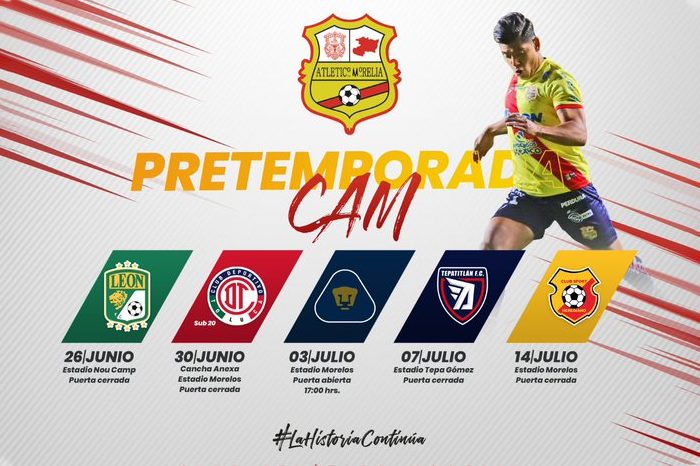 Redacción / La Voz de Michoacán Morelia, Michoacán. Como parte de la pretemporada rumbo al arranque del Torneo Apertura 2021 de la Liga BBVA Expansión MX, los “Canarios” del Club Atlético Morelia sostendrán los siguientes juegos de preparación: Sábado 26 de junio vs León. (Estadio Nou Camp)Miércoles 30 de junio vs Toluca sub-20. (Cancha Anexa, Estadio Morelos)Sábado 3 de julio vs Pumas. (Estadio Morelos)Miércoles 7 de julio vs Tepatitlán. (Estadio Tepa Gómez)Miércoles 14 de julio vs Club Sport Herediano. (Estadio Morelos) El encuentro ante los Pumas de la UNAM, será el único juego con acceso a la afición en el Estadio Morelos. Así, el cuadro michoacano se preparará de forma exigente de cara al inicio del campeonato, midiéndose con rivales de su misma categoría, Liga BBVA MX y Primera división del futbol de Costa Rica. Para finalizar, en la semana previa al inicio del torneo, los rojiamarillos viajarán a Estados Unidos para afrontar su último juego en horario y rival por confirmar.
