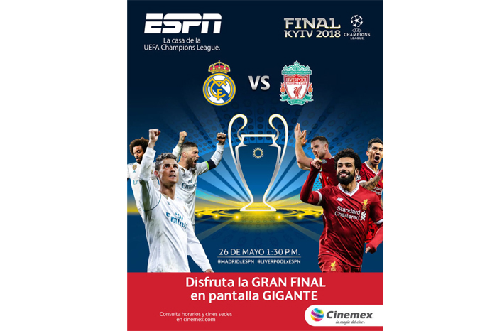 Notimex / La Voz de Michoacán Ciudad de México. Con la misión de llevar la magia del cine más allá de las películas, una cadena cinematográfica proyectará en 47 ciudades de la República Mexicana, la final de la Liga de Campeones de Europa. Los clubes Real Madrid y Liverpool se enfrentarán en la gran final de la edición 62 del prestigioso torneo, uno de los más importantes de Europa, y Cinemex ofrecerá sus butacas para que los amantes del balompié disfruten del partido con todas las comodidades. El encuentro por la preciada “orejona” se llevará a cabo este sábado en punto de las 13:45 horas y se transmitirá en las pantallas gigantes HD, así como en salas Platino de 104 complejos, se informó en un comunicado. De esta manera, los asistentes podrán disfrutar de una experiencia única, con tecnología de vanguardia, comodidad y servicios de primera calidad. El partido se exhibirá como parte de Espacio Alternativo, concepto original de la empresa en la que se puede apreciar de una gran variedad de contenidos alternos al séptimo arte como lo son los eventos deportivos, ballet, opera, moda, entre otros.
