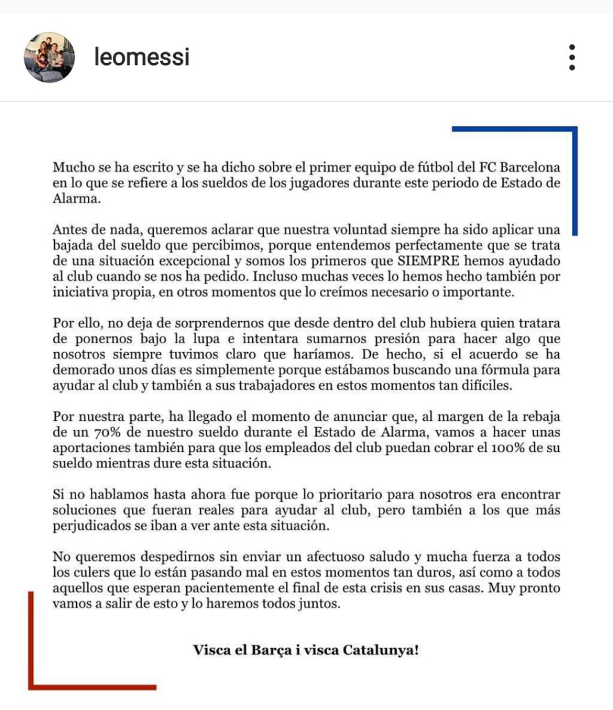 El Universal / La Voz de Michoacán Los futbolistas del Barcelona anunciaron se bajarán el sueldo un 70 por ciento, durante el Estado de Alarma en España por la pandemia de coronavirus. Lionel Messi, capitán blaugrana, y otros jugadores publicaron un comunicado en redes sociales al anunciar la decisión del plantel, que también permite que los trabajadores del club puedan cobrar el 100% de su salario; además de que fueron críticos con la directiva, encabezada por Josep Bartomeu. El argentino, al ser el líder dentro del vestuario, fue el primero en hacer pública la situación. Antes que nada, queremos aclarar que nuestra voluntad siempre ha sido aplicar una baja del sueldo que percibimos, porque entendemos perfectamente que se trata de una situación excepcional y somos los primeros que siempre hemos ayudado al club cuando se nos ha pedido". El escrito también revela un conflicto interno entre los jugadores y la directiva. Messi, Luis Suárez, Arturo Vidal y compañía denunciaron "presiones" para realizar esta acción, la cual, subrayaron, ya estaba tomada. "No deja de sorprendernos que desde dentro del club hubiera quien tratara de ponernos bajo la lupa e intentara sumarnos presión para hacer algo que nosotros siempre tuvimos en claro que haríamos", añadieron. La semana pasada, la junta directiva del Barcelona comunicó que bajaría los sueldos "de todos los estamentos del club". La medida apuntaba a "evitar pérdidas millonarias por la paralización de las competiciones deportivas, especialmente del futbol, cuya fecha de reinicio es un misterio". Sin embargo, los directivos no habían dado mayores detalles respecto de en qué porcentaje se reducirían los salarios y si afectaría del mismo modo a todos los integrantes del plantel.