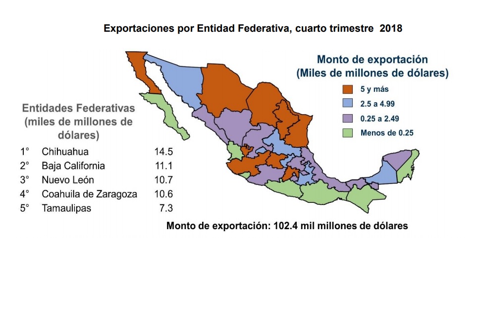 México. En el cuarto trimestre de 2018, Chihuahua, Baja California y Nuevo León fueron las principales entidades federativas que realizaron exportaciones de mercancías, de acuerdo con el Instituto Nacional de Estadística y Geografía (INEGI).
