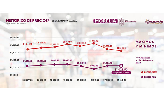 Redacción / La Voz de Michocán Morelia, Michoacán. El precio de 25 productos de la canasta básica comparados por la Secretaría de Desarrollo Económico (Sedeco) del gobierno estatal, continúa por arriba de los mil pesos, y de las tiendas en 6 municipios analizados, en Lázaro Cárdenas y Zitácuaro están más baratos. En la capital michoacana, el Tianguis de la Feria se mantiene como el lugar con precios más accesibles y Aurrerao como la tienda más cara. Xóchitl Godoy Toscano, directora de Comercialización de la Sedeco, indicó que en los mercados municipales los precios están más altos, pero la calidad de los productos es la mejor. PRECIOS EN MORELIA • Tianguis de la Feria: $1,028.50• Mercado de Abasto: $1,082.00• Soriana: $1,107.50• La Blanquita: $1,133.00• Walmart: $1,152.50• Super Regalo de Dios (colonia Vasco de Quiroga): $1,169.30• Merza: $1,171.18• Mercado Independencia: $1,176.00• Mercado San Juan: $1,197.00• Chedraui: $1,202.60• Aurrera: $1,212.30 PRECIOS EN CINCO MUNICIPIOS MÁS Zamora • Aurrera: $1,046.00• Soriana: $1,051.10• Walmart: $1,100.80• Mercado Municipal: $1,118.50• Merza: $1,122.22 Uruapan • Soriana: $1,010.60• Aurrera: $1,033.40• Mercado Municipal: $1,034.00• Wamart: $1,079.30 Lázaro Cárdenas • Aurrera: $991.20• Tiendas Neto: $997.40• Soriana: $1,012.20• Mercado Municipal: $1,018.00• Walmart: $1,046.20 Zitácuaro • Aurrera: $991.44• Chedraui (Super Ché): $1,025.60• Mercado Municipal: $1,137.00 Apatzingán • Mercado Municipal: $1,086.50• Aurrera: $ 1,121.80