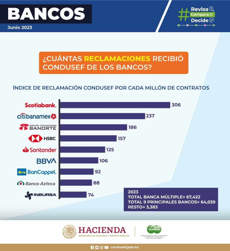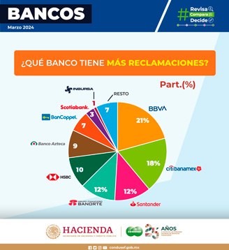 Redacción / La Voz de Michoacán Ciudad de México. La Comisión Nacional para la Protección y Defensa de los Usuarios de Servicios Financieros (CONDUSEF), dio a conocer cifras de los bancos con mayor número de reclamaciones durante el año pasado. De acuerdo con la institución, los bancos con el mayor número de reclamaciones hasta la fecha son encabezados por BBVA, con un considerable 21% del total. Le sigue Citibanamex con un 18% y Santander con un 12%. Seguido de estos está Banorte con un 12%, HSBC con un 10%, Banco Azteca con un 9%, Bancoppel con un 7%, Scotiabank con un 3% e Inbursa con un 1%; mientras que el resto de los bancos de México representan el 7% del total de las reclamaciones. Sin embargo, es importante destacar que, aunque BBVA y Banorte cuentan con un gran número de clientes, lo que naturalmente puede aumentar la cantidad absoluta de reclamaciones. Así, los bancos con los mayores índices de reclamaciones por cada millón de contratos son Scotiabank, Citibanamex y Banorte, con 306, 237 y 186 puntos respectivamente. A estos le siguen HSBC con 157, Santander con 125, BBVA con 106, Bancoppel con 82, Banco Azteca con 88 e Inbursa con 74 de quejas en proporción a su cantidad total de clientes.