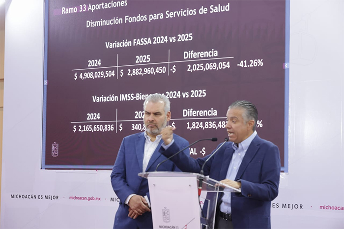 Redacción / La Voz de Michoacán Morelia, Michoacán. Sin déficit, sin deuda, sin nuevos impuestos; realista, austero y detonante en inversión, así como mayor apoyo a los municipios, a educación, infraestructura, seguridad y bienestar, destacó el secretario de Finanzas del Gobierno de Michoacán, Luis Navarro García, sobre el Presupuesto de Egresos que se tiene proyectado para 2025. En el desglose que hizo este viernes Navarro García obre el gasto estatal del próximo año, destaca la reducción de -42.22% en el rubro de Servicios de Salud de Michoacán, mientras que entre los registran incremento se encuentran Seguridad Pública, Obras Públicas, Bienestar, Universidad Michoacana de San Nicolás de Hidalgo (UMSNH), Finanzas, incluso el Zoológico de Morelia. El secretario de Finanzas destacó que en total, el Presupuesto de Egresos 2025 asciende a 98 mil 933 millones 474 mil 315 pesos, destacando también un aumento en participaciones federales, que en 2025 se proyectan 42 mil 519 millones 322 mil 631 pesos, así como Transferencias Federales por Convenio, de 4 mil 782 millones 926 mil 881 pesos, y en Incentivos derivados de la Coordinación Fiscal, de 516 millones 790 mil 602 pesos. Asimismo, se destina un menor monto al pago de deuda a largo plazo, de 3 mil 686 millones 544 mil 221 pesos a 3 mil 215 millones 230 mil 48 pesos, una reducción equivalente a -12.78%. Luis Navarro resaltó que los ingresos de fuentes locales también registran incremento, de 6 mil 318 millones 654 mil 452 pesos en 2024 a 8 mil 495 millones 949 mil 160 pesos en 2025. Respecto a las reducciones, en Servicios de Salud en Michoacán se contempla invertir 5 mil 407 millones 951 mil 902 pesos el próximo año, cuando en el previo se destinó un gasto de 9 mil 360 millones 2024 mil 179 pesos. En contraparte, el incremento para 2025 en Educación es de 5.25%, con 31 mil 46 millones 385 mil 483 pesos a ejercer; en Seguridad Pública 15.18% (4 mil 647 millones 48 mil 530 pesos); en Obras Públicas, de 39.20% (5 mil millones 544 mil 114 pesos); en Bienestar, de 30.51% (362 millones 607 mil 445 pesos); en la UMSNH de 20.10% (4 mil 452 millones 96 mil 344 pesos; y en el Zoológico de Morelia de 34.41% (76 millones 240 mil 783 pesos). DESGLOSE DEL PRESUPUESTO DE EGRESOS 2025