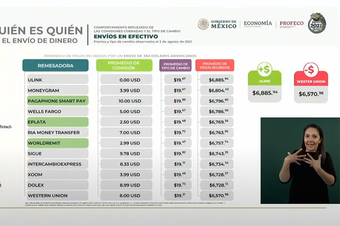 Redacción / La Voz de Michoacán México. En un comparativo para determinar la mejor opción para el envío de remesas desde el extranjero a Michoacán y todo México, ULINK resultó con la mayor calificación por parte de la Procuraduría Federal del Consumidor (Profeco). De acuerdo con el estudio de la Profeco, ULINK no cobra comisión, tiene un promedio de tipo de cambio de $19.67 y un promedio de pesos recibidos en efectivo de $6,885.94 por un envío de 350 dólares. Mientras que la peor opción para que los dólares rindan es Western Union, que tiene una comisión establecida de 8 dólares, un promedio de tipo de cambio de $19.21, pero el destinatario recibe $6,570.95. Otras tres empresas que cobran una baja comisión y que tienen un mayor rendimiento en cuanto a la conversión de pesos son Pagaphone Smart Pay, que cobra 10 dólares de comisión en promedio y se reciben un promedio de $6,796, con un promedio de tipo de cambio de $19.99. Además, Eplata, con 2.50 dólares de comisión, $19.48 promedio de tipo de cambio y $6,769.56 promedio de pesos recibidos. Y WorldRemit, con 2.99 dólares de comisión, $19.47 el tipo de cambio promedio y $6,757.74 recibidos en pesos en promedio. En cuanto a depósito a cuenta, Moneygram es la mejor opción por el envío de 350 dólares, con cero comisión, $19.76 promedio de tipo de cambio y $6,917.65 pesos en promedio recibidos. Ricardo Sheffield, titular de la Profeco, destacó que en junio las remesas en México ascendieron a 4 mil 440 millones de dólares, 41.4% por encima del mismo mes de 2018, cuando inició la administración que encabeza Andrés Manuel López Obrador; 38% y 25% más que en junio 2019 y 2020, respectivamente. Envíos en efectivo: Depósito a cuenta: