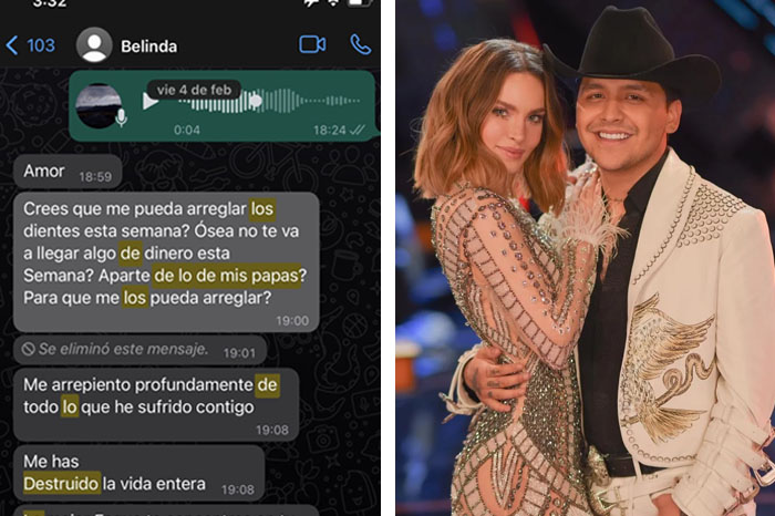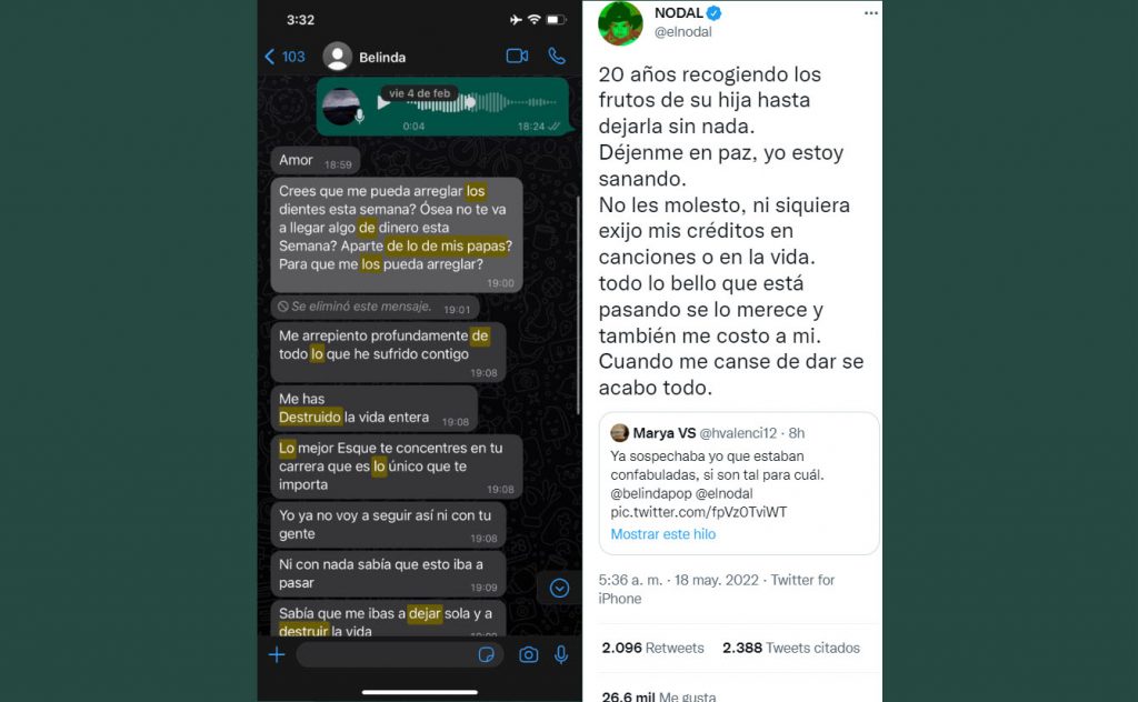 EFE / La Voz de Michoacán Ciudad de México. El cantante mexicano Christian Nodal exhibió este miércoles una supuesta conversación que mantuvo con Belinda para mostrar que la cantante le pedía dinero para cuidados personales y para sus padres. “Cuando me cansé de dar se acabó todo”, escribió Nodal en Twitter y compartió una captura de pantalla del WhatsApp de una supuesta conversación con su exnovia. El intérprete del regional mexicano mostró las imágenes después de recibir una serie de críticas indirectas por parte de la madre de su exprometida, Belinda Schüll. “¿Crees que me pueda arreglar los dientes esta semana? o sea, ¿no te va a llegar algo de dinero esta semana aparte de lo de mis papás para que me los pueda arreglar?”, son las presuntas palabras que Belinda escribió el 4 de febrero. Según la conversación, tras algunos minutos sin respuesta de su entonces prometido, la artista mexicana le dijo lo arrepentida que estaba de seguir en dicha relación. “Sabía que me ibas a dejar sola y a destruir la vida”, se lee en la misma imagen. Las contestaciones de Nodal llegan después de que Schüll le diera “me gusta” y publicara “emojis” de aplausos a un comentario de un seguidor que celebraba que Belinda hubiera terminado con Nodal, llamándolo “naco”, un insulto mexicano con connotaciones clasistas. Después, la madre de la cantante de “Egoísta” subió una foto a su perfil de Instagram con la leyenda: “El mundo está lleno de personas que quieren recoger los frutos de árboles que nunca sembraron ni cuidaron”. Esto detonó la indignación en los fanáticos del músico de regional mexicano, quienes acusaron a Belinda y a su madre de “confabular” juntas en contra de Christian por lo que el cantante decidió responder. “Veinte años recogiendo los frutos de su hija hasta dejarla sin nada”, escribió Nodal en Twitter respondiendo a Schüll. “Déjenme en paz, yo estoy sanando. No les molesto, ni siquiera exijo mis créditos en canciones o en la vida. Todo lo bello que le está pasando se lo merece y también me costó a mí”, añadió. https://twitter.com/elnodal/status/1526874278779441152?s=20&t=qCV_Y3rCepoe2NZBpdYRYw Tras una ola de comentarios polarizados, el cantante de “Adiós amor” se dedicó a responder las acusaciones que recibió por exhibir a la cantante, y aunque algunas fans le comentaron que no tenía por qué dar explicaciones, el cantante respondió. “Sí tengo porque quiero enfocar mi carrera en dar amor desde lo más profundo para el mundo. Y con esta gente necia jalándome no lo voy a lograr. Necesito sacar a esos fantasmas que atormentan”, escribió. En febrero se hizo pública la ruptura del compromiso entre Nodal y Belinda, y desde entonces sus carreras artísticas tomaron rumbos distintos. Ambos cantantes residían en México, pero tras el fin de su relación él se mudó a Estados Unidos y ella a España.