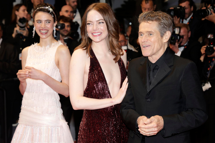 Junto a Stone, Margaret Qualley, con un vaporoso vestido rosa casi blanco; Willem Dafoe, con traje y camisa negro; Hunter Schafer, de azul satinado, y Lanthimos, con un traje cruzado azul claro poco habitual en las alfombras rojas del festival.