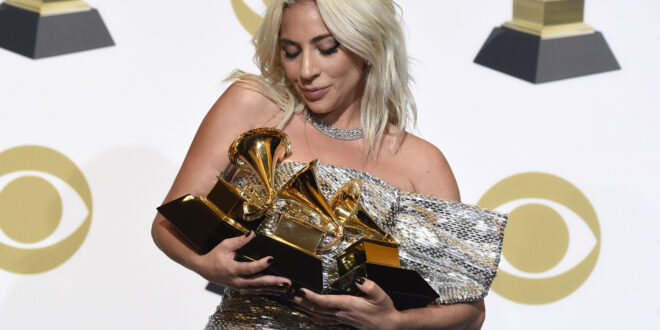ARCHIVO – En esta fotografía de archivo del 10 de febrero de 2019 Lady Gaga en la sala de prensa con sus premio a mejor interpretación solista por "Joanne (Where Do You Think You're Goin'?)", mejor interpretación pop de un dúo o grupo y mejor canción para un medio visual por "Shallow" en la 61a entrega anual de los Grammy en Los Angeles. Aunque Lady Gaga ganó premios en los Grammy de este año la banda sonora de "A Star is Born" podría competir en categorías como álbum del año y mejor vocal pop para la gala de 2020. (Foto Chris Pizzello/Invision/AP, archivo)