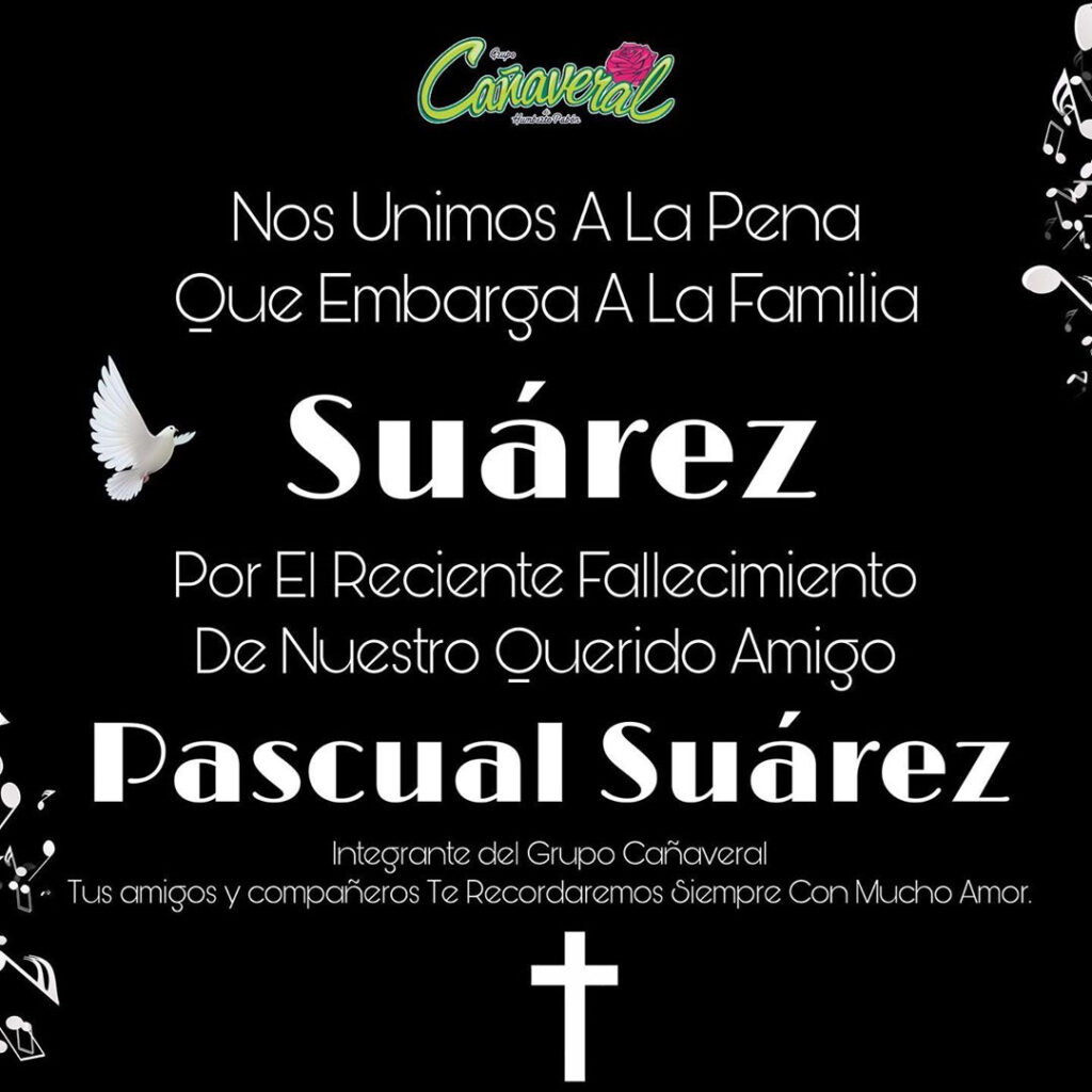 Agencias / La Voz de Michoacán Ciudad de México. El Grupo Cañaveral sufrió la muerte de uno de sus integrantes, el músico Pascual Suárez. En la cuenta de Instagram de la agrupación formada por Humberto Pabón se anunció el deceso. “Con gran tristeza nos unimos a la pena que embarga a la familia Suárez por el reciente fallecimiento de nuestro querido amigo Pascual Suárez, quien formó parte de la familia del @grupocanaveral”, se indicó en el mensaje. "Nuestro más sentido pésame y nuestras oraciones deseando una pronta resignación a toda la familia, Descansa en paz". Foto: Twitter En la red social del grupo se compartió una esquela y algunas fotografías de Pascual Suárez en su labor como encargado del trombón. Hasta el momento se desconoce la causa del fallecimiento, pues el grupo únicamente reflejo sus condolencias y su apoyo para la familia del integrante. Foto: Twitter Y a través de un comunicado que lanzó el día de ayer anunció qué debido a la pérdida de su compañero y amigo, se verán obligados a mover la fecha de su presentación “Bailando Desde Casa” que estaba programada para el 10 de julio, por lo que fue recorrida para el día 25 de julio. Sus fans mostraron mucho apoyo a través de los comentarios de las publicaciones que el grupo compartió, pues algunos reflejan el cariño que en algún momento compartieron en convivencias o presentaciones con el músico.