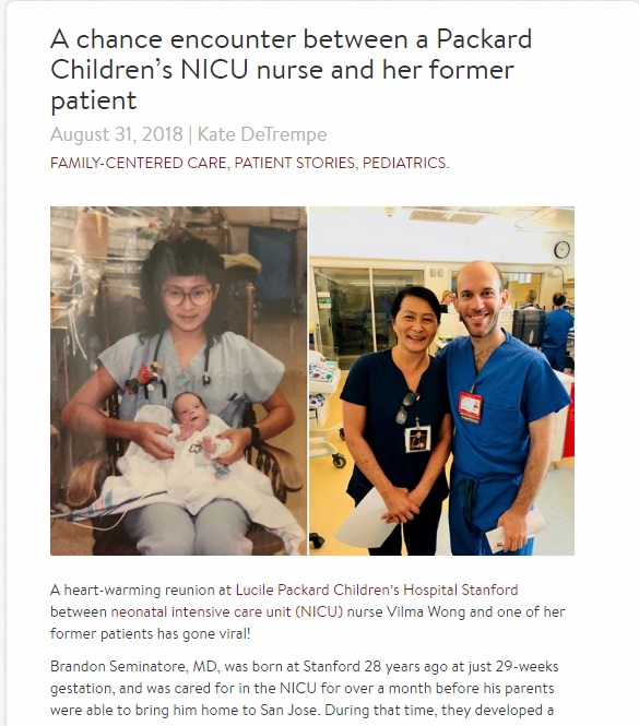 A través de Facebook, el hospital infantil de Stanford publicó dos fotos en las que se puede ver a Brandon y Vilma juntos hace 28 años cuando Brandon era un bebé y actualmente tras su reencuentro como colegas en el hospital.