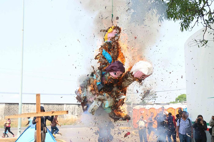 Los manifestantes colgaron y prendieron fuego a la piñata alusiva al presidente de Estados Unidos montado sobre el símil de un dinosaurio personificado con la cabeza del presidente de México, de la secretaria de Gobernación, Olga Sánchez Cordero, y de la delegada regional del INM, Carmen Yadira de los Santos.
