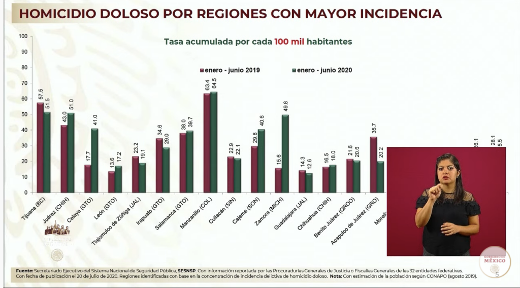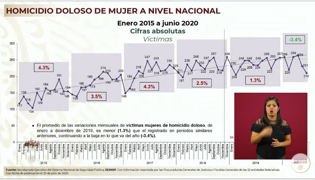 Redacción / La Voz de Michoacán Ciudad de México. El secretario de Seguridad, Alfonso Durazo Montaño, informó que por cuarto mes consecutivo se registraron a la baja los homicidios dolosos cometidos en el país. Durante la conferencia de prensa del presidente Andrés Manuel López Obrador, en Palacio Nacional, Durazo Montaño explicó que en junio se registraron 2 mil 851 homicidios dolosos, en comparación con los 2 mil 918 del mes previo. Durazo dijo que de enero a junio de este año se registró un -0.8% de homicidios dolosos en comparación con el periodo anterior. Sin embargo, en el caso de los feminicidios, en junio se registraron 99 casos, es decir, 26 más que en mayo, cuando se reportaron 73 feminicidios. Al presentar el informe mensual sobre la incidencia delictiva, de acuerdo con las estadísticas que dio a conocer el funcionario, en lo que va del año el promedio mensual de feminicidios se ha incrementado 7.7%. El Estado de México, Veracruz, Ciudad de México, Puebla y Nuevo León encabezan la lista de entidades donde se reportan más feminicidios de enero a junio del presente año. Con información de El Universal