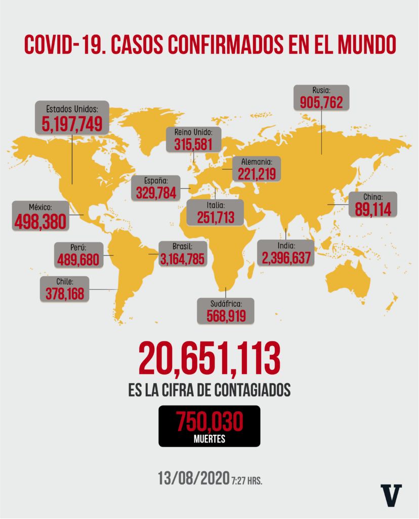 Enrique Santiago / La Voz de Michoacán Morelia, Michoacán La pandemia de COVID-19 mantiene en vilo al mundo. En un sólo día se agregan 262 mil 705 nuevos contagios. India es la nación con más enfermos nuevos en las últimas 24 horas con 66 mil 999 y en segundo lugar se ubica Brasil con 55 mil 155 contagios. Te presentamos un panorama global actualizado al 13 de agosto de 2020 sobre el comportamiento del COVID-19. Fuente: Johns Hopkins University of Medicine. Diseño: Enrique Santiago,La Voz de Michoacán. El cúmulo de contagios en el mundo sigue al alza y hoy se acumula 20 millones 651 mil 113. Estados Unidos sumó 47 mil 159 nuevos casos, en tercer lugar en la lista de países con más nuevos casos. Fuente: Dirección General de Epidemiología de la Ssa. Diseño: Enrique Santiago, La Voz de Michoacán. Con 5 mil 858 casos de COVID-19 confirmados en las últimas 24 horas, México registró este miércoles 498 mil 380 personas infectadas de coronavirus, por lo que, de continuar la tendencia de los últimos días, mañana mismo rebasaría el medio millón de contagios. Fuente: Centro Estatal de Operaciones COVID-19 de la SSM. Diseño: Enrique Santiago, La Voz de Michoacán. En las últimas horas se registró la muerte de 22 personas más que tenían COVID-19, con lo que Michoacán llegó a 906 defunciones por esta causa en cuatro meses y medio de epidemia.