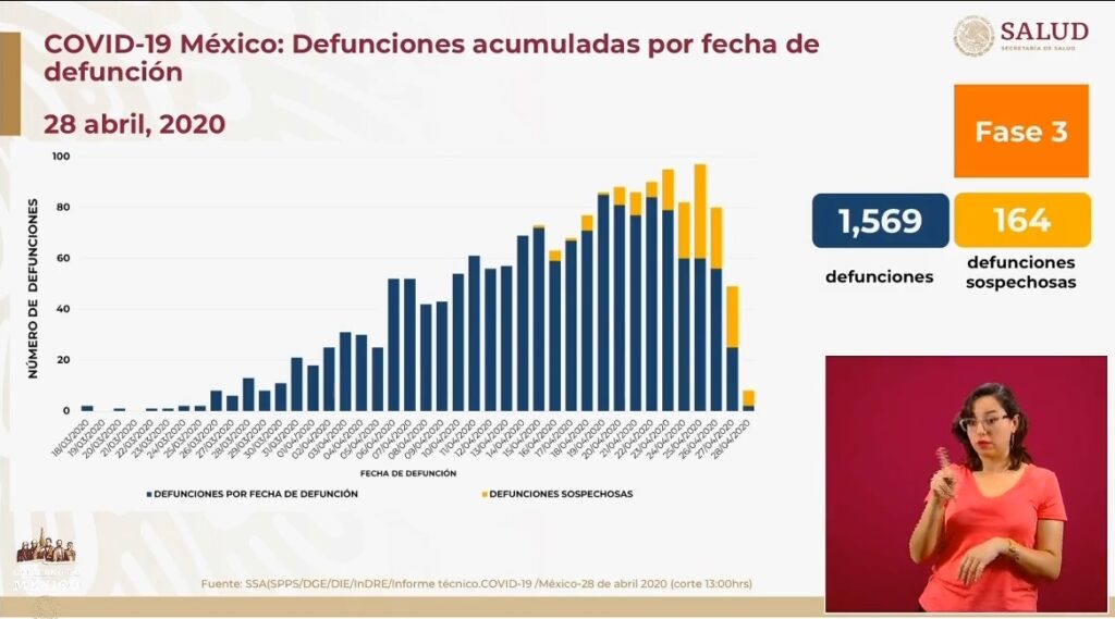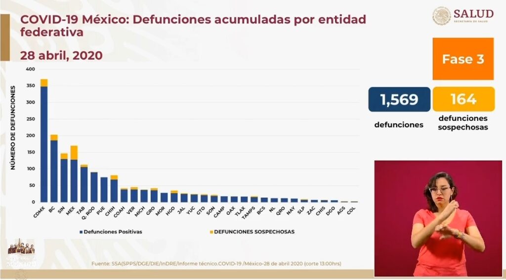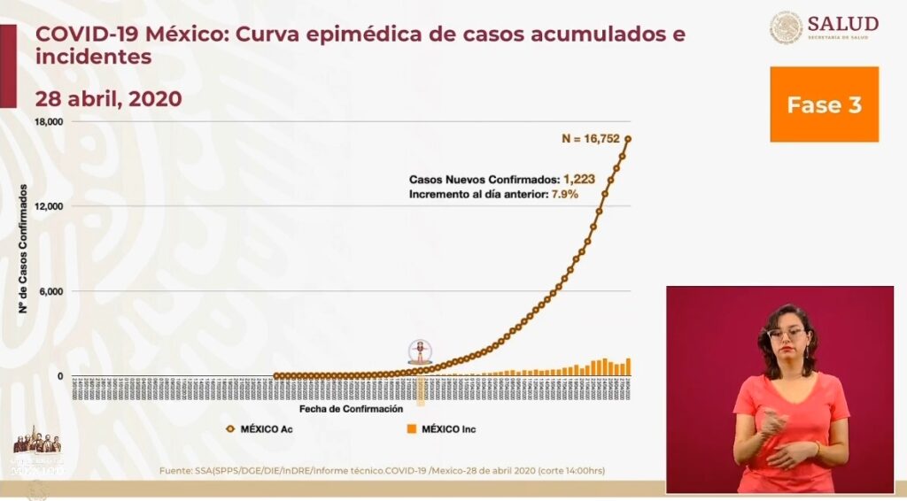 Ciudad de México. Con 1,223 contagios nuevos en el último día, México llegó a 16,752 casos confirmados de COVID-19, de los cuales 5,329 se mantienen activos, es decir, que presentaron síntomas en los últimos 14 días, informaron este martes autoridades de la Secretaría de Salud federal (Ssa). Los decesos en el país suman ya 1,569 de los cuales 135 ocurrieron en el último día. Los casos sospechosos acumulados, es decir, que aún no reciben diagnóstico, son 11,220 mientras que las personas que han dado negativo al virus del SARS-CoV-2, que causa la enfermedad de COVID-19, suman 49,033 de un total de 77,005 personas estudiadas en el país. Fuente: DGE. Diseño: Enrique Santiago, La Voz de Michoacán. Hasta este martes, los entidades con más casos confirmados acumulados son: Ciudad de México (4,474)Estado de México (2,722)Baja California (1,391)Tabasco (890)Sinaloa (803) Los casos acumulados representan el total de personas que han dado positivos a la prueba para detectar el virus del SARS-CoV-2 desde la llegada del nuevo coronavirus a México, pero no son los casos actuales, pues algunos de los pacientes han sanado, otros han muerto y otros aún tienen la enfermedad activa. Por casos activos, es decir los que manifestaron inicio de síntomas de la enfermedad de COVID-19 en las últimas dos semanas, los estados con más casos son: Ciudad de México (1,521)Estado de México (943)Tabasco (326)Sinaloa (207)Baja California (201) La tasa de incidencia de casos activos en el país es de 4.17 por cada 100 mil habitantes, y las entidades con la mayor tasa en este rubro son: Ciudad de MéxicoTabascoQuintana RooSinaloaYucatán Defunciones La enfermedad del COVID-19 ha causado la muerte de 1,569 personas en todo el país, mientras que 164 fallecimientos se catalogan en este momento como sospechosos de la enfermedad, es decir, no se ha determinado si la causa de muerte es el padecimiento provocado por el nuevo coronavirus. Las entidades que reportan más decesos por COVID-19 hasta este día son: Ciudad de MéxicoBaja CaliforniaSinaloaEstado de MéxicoTabasco El pico más alto de fallecimientos reportado hasta hoy ocurrió el 25 de abril, incluyendo los casos sospechosos, que están en espera de resultados de la prueba, como se muestra en la siguiente gráfica: Curva epidémica Los datos presentados en la conferencia de prensa desde Palacio Nacional son con base en los datos reportados hasta las 13:00 horas de este martes por las propias entidades y captados por la Ssa, a través de sus dependencias: la Secretaría de Prevención y Promoción de la Salud, la Dirección General de Epidemiología y el Instituto de Diagnóstico y Referencia Epidemiológicos (InDre). Casos día por día Diseño: La Voz de Michoacán Diseño: La Voz de Michoacán.