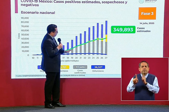 Alomía Zegarra apuntó que los casos estimados de personas con COVID-19 en México son 349 mil 893, y los casos activos estimados son 49 mil 467, que representan 14 por ciento del total de acumulados estimados. Asimismo, las defunciones estimadas en el país serían 38 mil 263.
