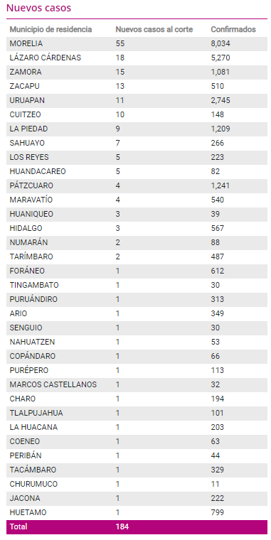 Casos acumulados Confirmados Recuperados Muertes Morelia 8,034 6,984 611 Lázaro Cárdenas 5,270 4,864 321 Uruapan 2,745 2,415 270 Pátzcuaro 1,241 1,100 76 La Piedad 1,209 1,094 57 Zamora 1,081 899 104 Jorge Ávila / La Voz de Michoacán Morelia, Michoacán. Los decesos por COVID-19 en el estado tuvieron un ligero decremento en la entidad, esto al no sobrepasar los diez en las últimas 24 horas. Así, este viernes 1 de enero se registraron 5 defunciones por el nuevo coronavirus en toda la entidad, parea un acumulado total de 2 mil 700. Los nuevos fallecidos, se registraron en Lázaro Cárdenas, Zamora, Paracho, La Piedad y Morelia, con uno en cada municipio. Además, en el estado se tuvo notificación de 184 nuevos contagios, por lo que ya suman 33 mil 224 durante la emergencia sanitaria a causa de la pandemia del virus SARS-CoV-2. El mayor número de contagios de este día los reportó Morelia, con 55 (para un total de 8 mil 034); seguido de Lázaro Cárdenas, con 18 (tiene 5 mil 270 en total); Zamora, con 15 (ya suma mil 081); Zacapu, con 13 (ya cuenta con 510); Uruapan, con 11 (para un total acumulado de 2 mil 745), y Cuitzeo, donde este viernes se reportan 10 nuevos casos (suma 148). En Michoacán las personas recuperadas suman 28 mil 948, de las cuales 6 mil 984 han sido dadas de alta en Morelia, 4 mil 864 en Lázaro Cárdenas, 2 mil 415 en Uruapan, mil 100 en Pátzcuaro y mil 094 en La Piedad. Actualmente en la entidad mil 576 enfermos mantienen la epidemia activa y de estos, 439 se encuentran en Morelia, 70 en Zitácuaro, 78 en Zamora y 85 en Lázaro Cárdenas. Y de casos sospechosos, de un total de 2 mil 094 que se estudian en el territorio michoacano, en Morelia hay 531, 76 en La Piedad, 65 en Lázaro Cárdenas, 108 en Uruapan, 77 en Zitácuaro y 105 en Zamora.
